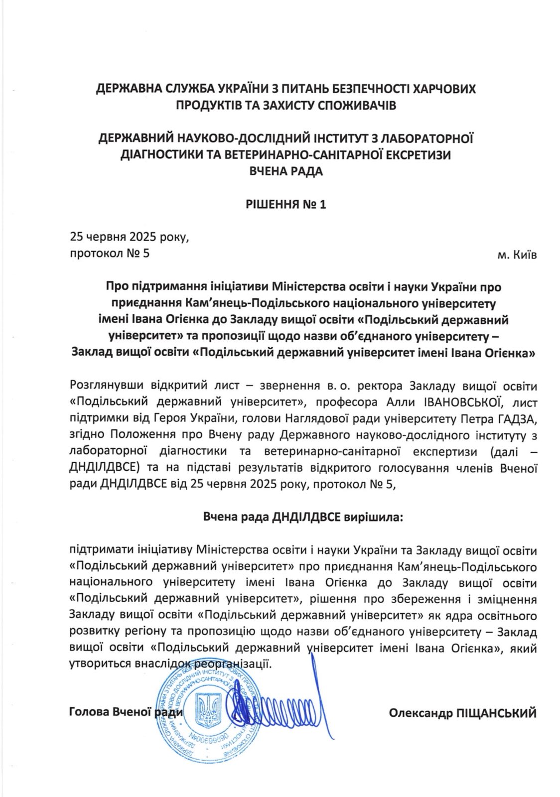 Рішення Вченої ради ДНДІЛДВСЕ «Про підтримання ініціативи МОН про приєднання Кам'янець-Подільського національного університету імені Івана Огієнка до Закладу вищої освіти "Подільський державний університет" та пропозиції щодо назви об'єднаного університету - ЗВО "Подільський державний університет імені Івана Огієнка", який утворюється внаслідок реорганізації.