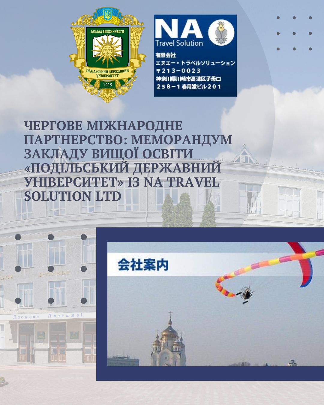 Закладом вищої освіти «Подільський державний університет» та японською компанією NA Travel Solution підписано договір про Міжнародну співпрацю. Цей договір є одним із важливих кроків активної співпраці між урядами Японії та України у рамках підтримки сільськогосподарського виробництва в умовах війни та його активного відновлення у повоєнний період.