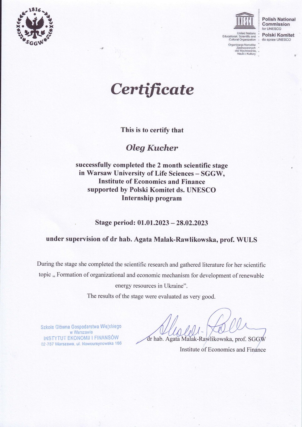З 1 січня до 28 лютого 2023 року відбулось міжнародне науково-педагогічне стажування за грантовою програмою Національної комісії Польщі у справах ЮНЕСКО доцента, кандидата економічних наук, асистента кафедри менеджменту, публічного управління та адміністрування КУЧЕРА Олега Володимировича.