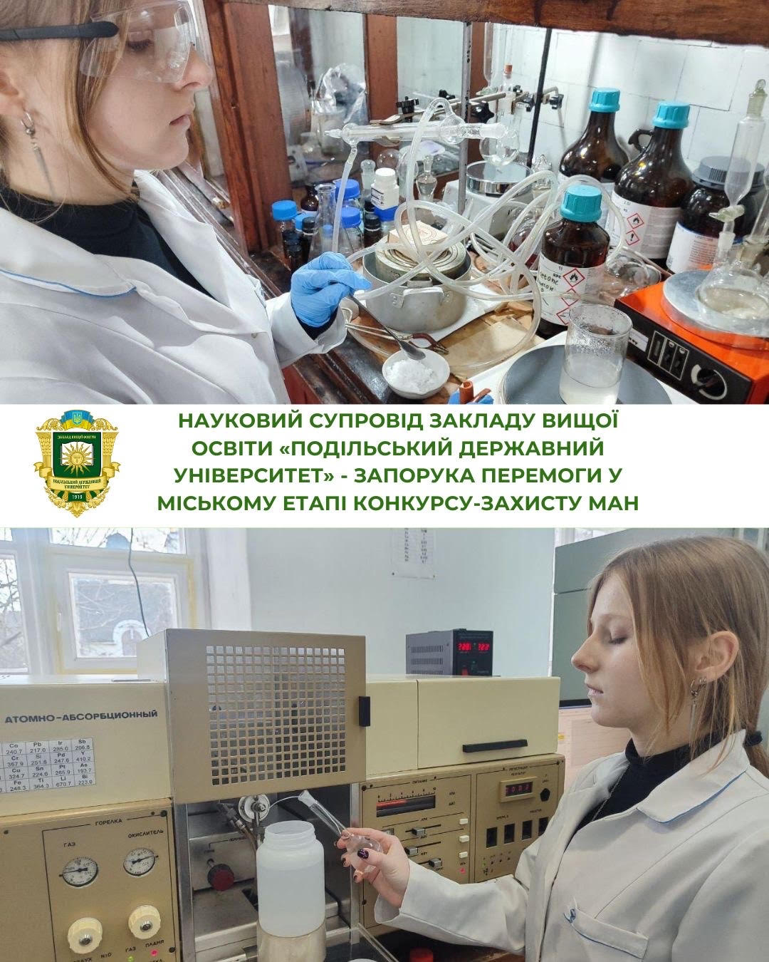На базі кафедри хімії Навчально-наукового інституту харчових технологій Закладу вищої освіти «Подільський державний університет» було виконано науково-дослідну роботу, яка здобула перше місце на міському етапі Всеукраїнського конкурсу-захисту науково-дослідницьких робіт учнів – членів Малої академії наук України у секції «Загальна та неорганічна хімія».