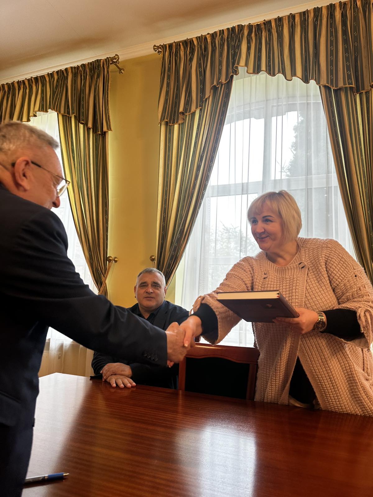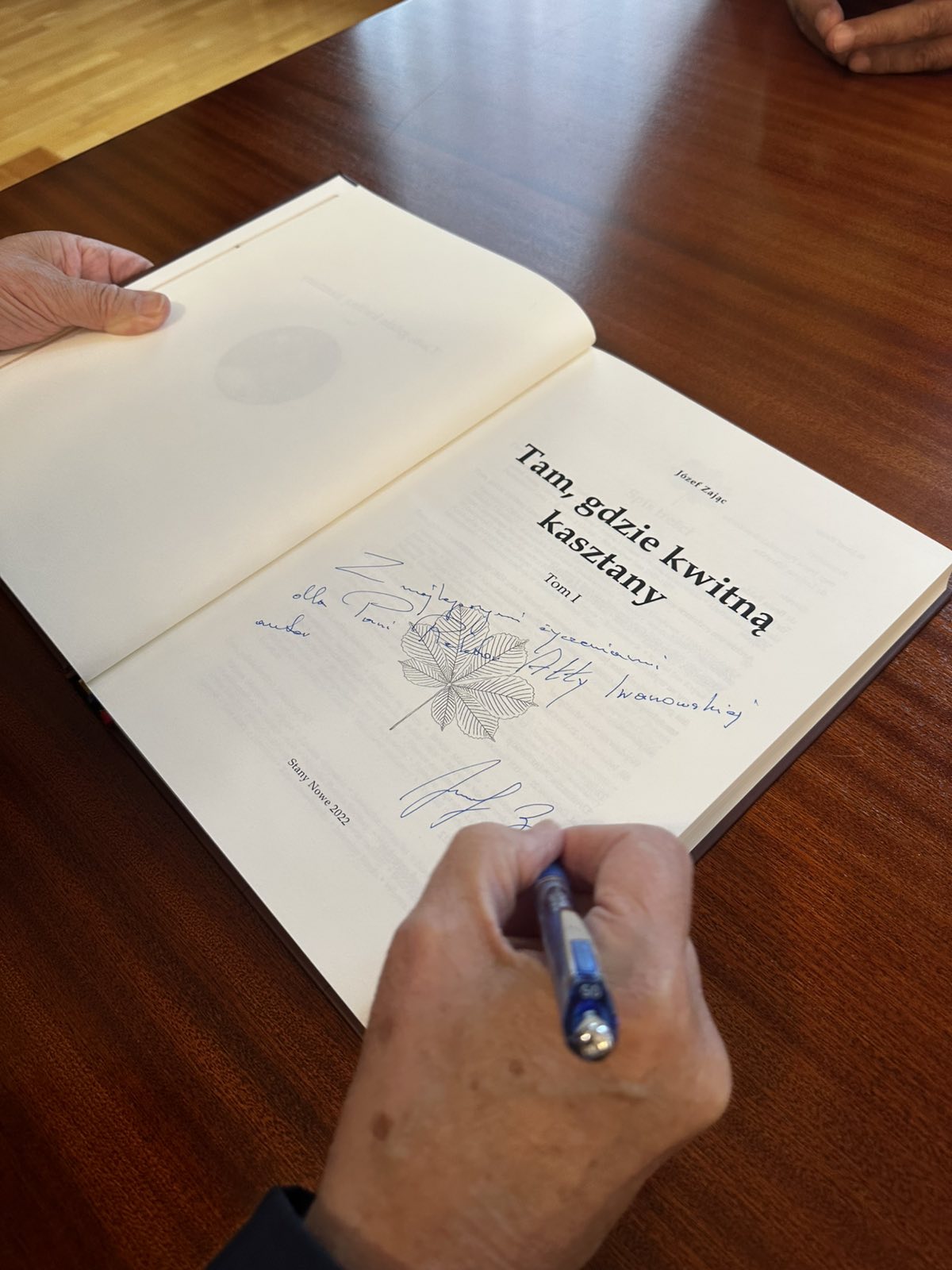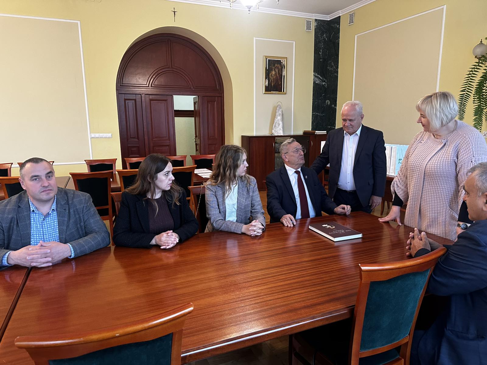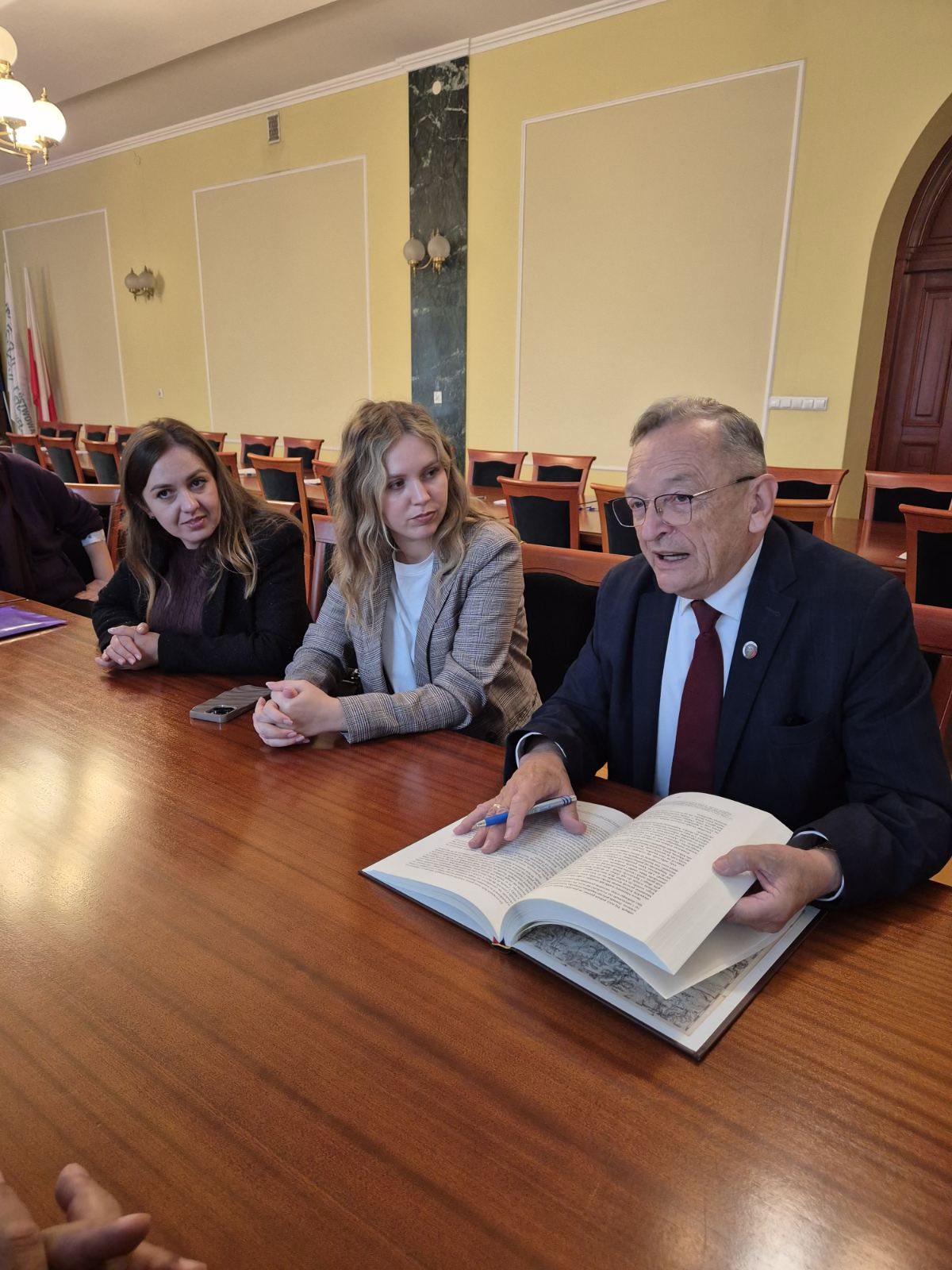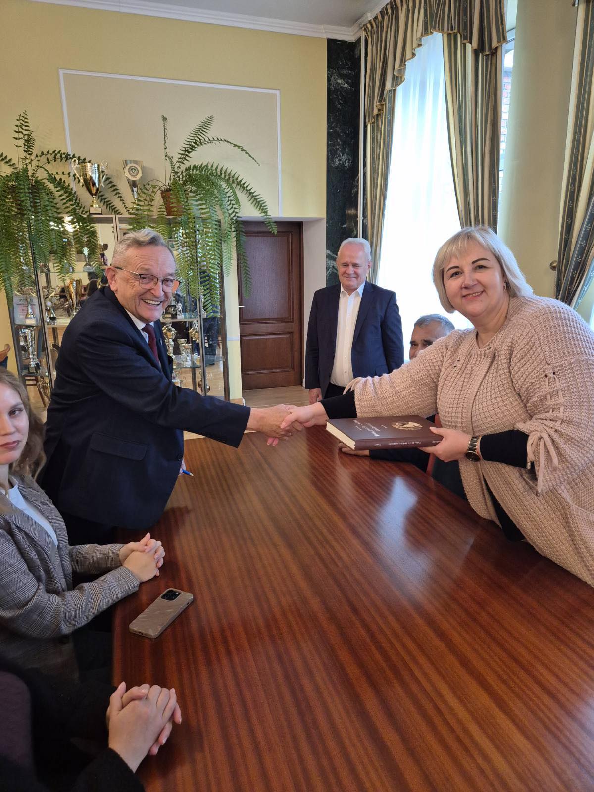 Сьогодні третій день візиту делегації розпочався у головному корпусі Державної академії прикладних наук у Холмі, де проректор з розвитку, проф. д-р габ. Юзеф Заяц, урочисто передав в.о. ректора нашого університету Аллі ІВАНОВСЬКІЙ авторську книгу «Там, де квітнуть каштани» з особистим підписом. Цей символічний дарунок став знаком високої поваги та підтвердженням прагнення до подальшого зміцнення партнерських відносин між українським і польським університетами.