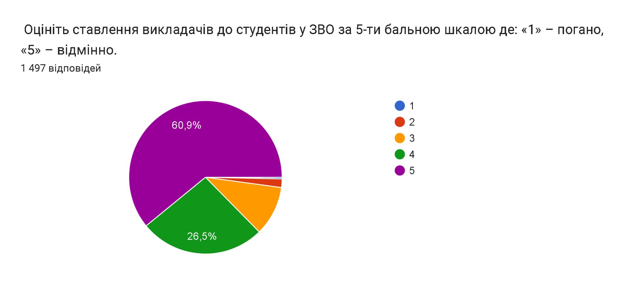 Успіх викладача зумовлений не лише власними професійними здобутками, але й здатністю налагодити сталі комунікаційні стосунки зі студентами, що відмічають в своїх анкетах здобувачі, оцінюючи ставлення викладачів до студентів: 61% – на «відмінно», 26,5% – на «добре».
