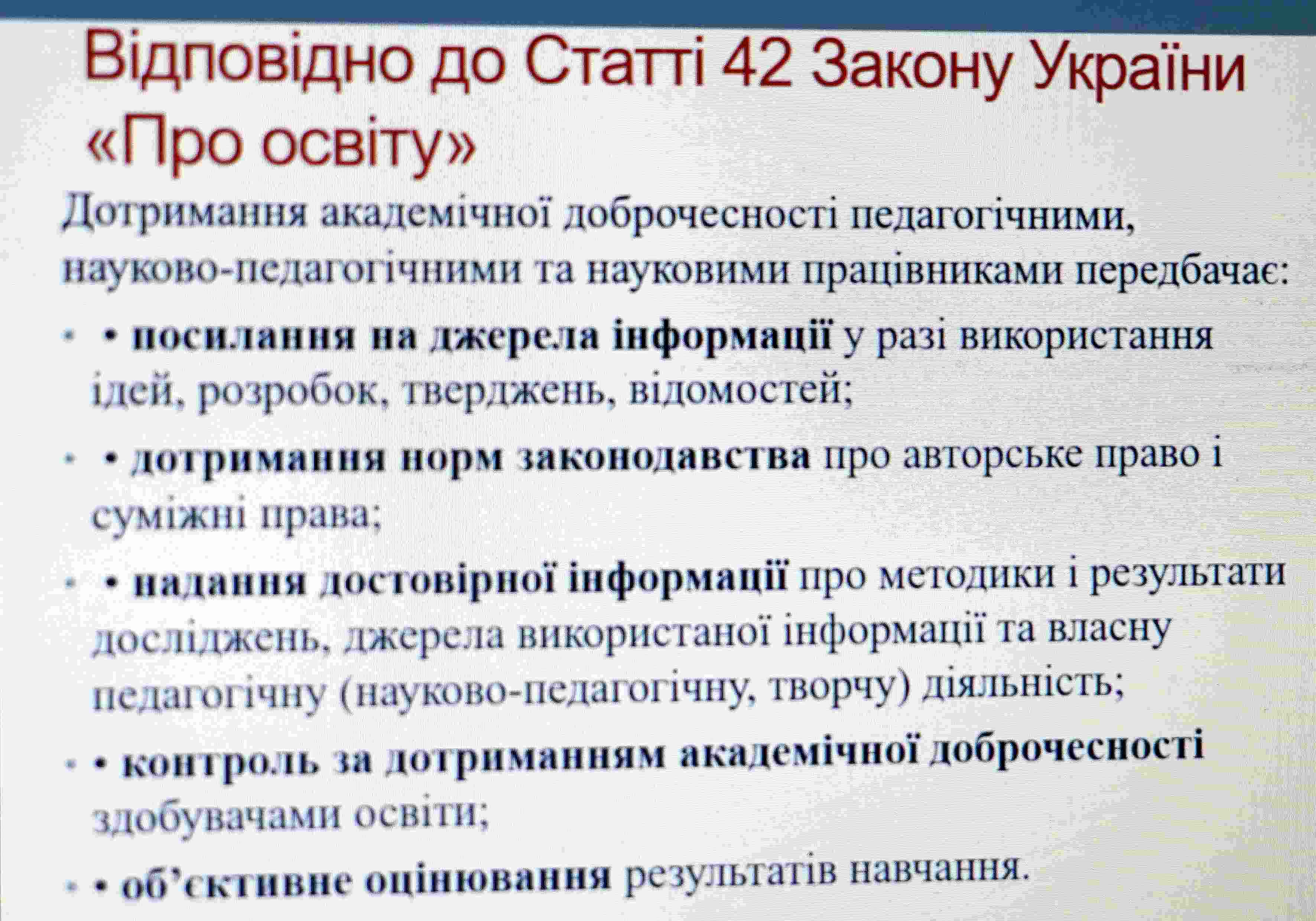Присутніх ознайомили з поняттям академічної доброчесності, його складниками, принципами, а також видами порушень та відповідальністю за порушення, наголосили на тих компетентностях академічної доброчесності, які має набути здобувач освіти під час навчання.