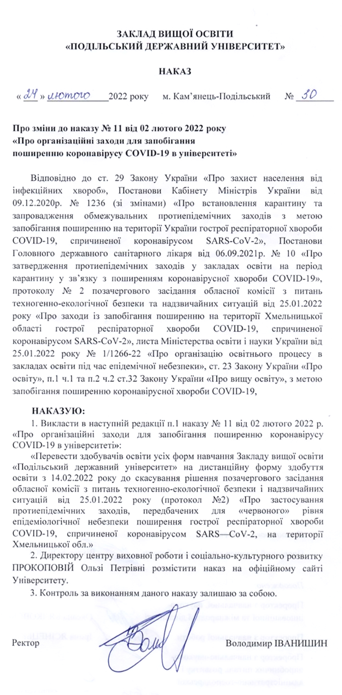 Про зміни до наказу № 11 від 02 лютоrо 2022 року «Про організаційні заходи для запобігання поширенню коронавірусу COVID-19 в університеті»