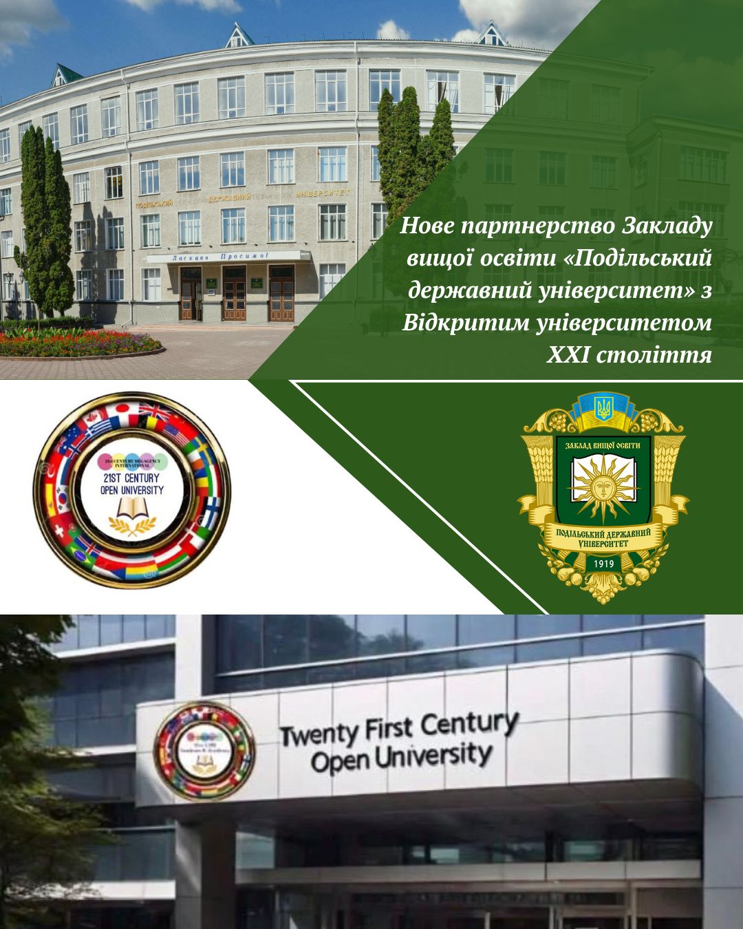 Заклад вищої освіти «Подільський державний університет» продовжує послідовну реалізацію стратегії інтернаціоналізації та розширення міжнародних партнерств, спрямованих на підготовку фахівців, здатних працювати в умовах глобальних викликів і післявоєнного відновлення України. Важливим кроком у цьому напрямі стало підписання меморандуму про співпрацю з 21st Century Open University (США).