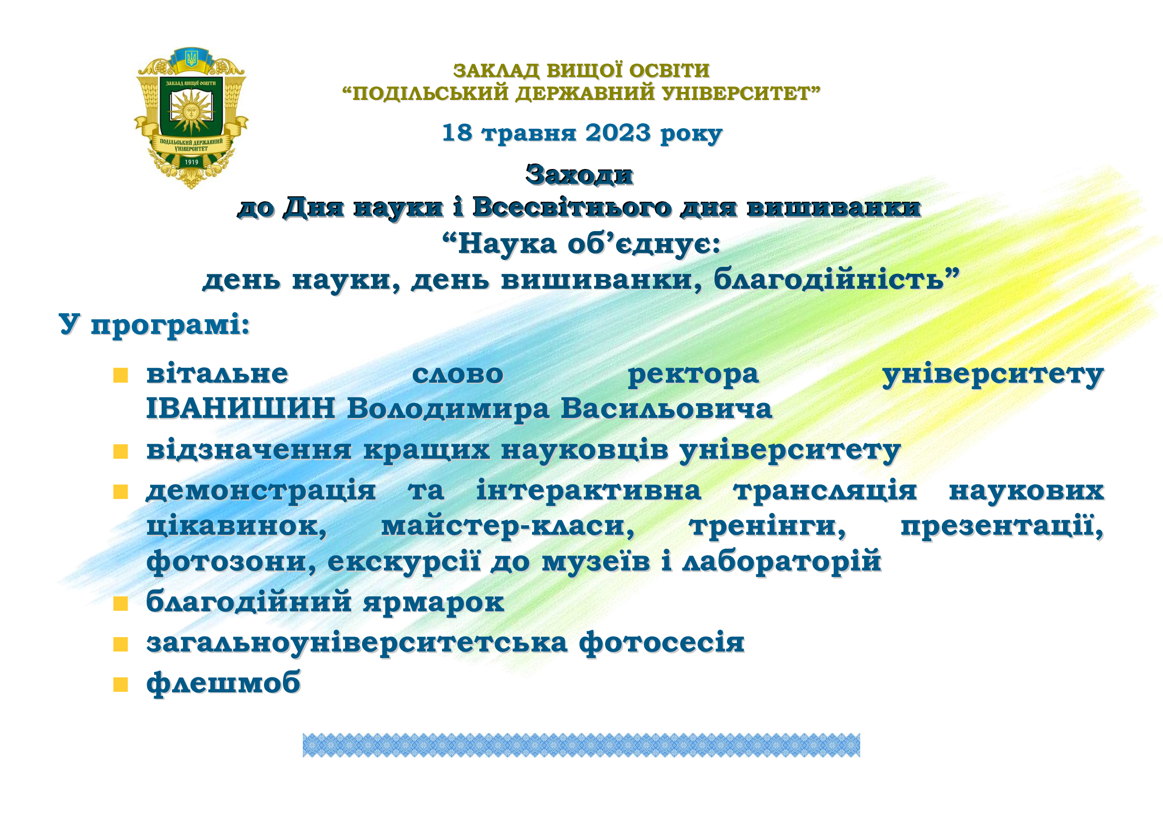 Заходи до Дня науки і Всесвітнього дня вишиванки “Наука об’єднує: день науки, день вишиванки, благодійність”