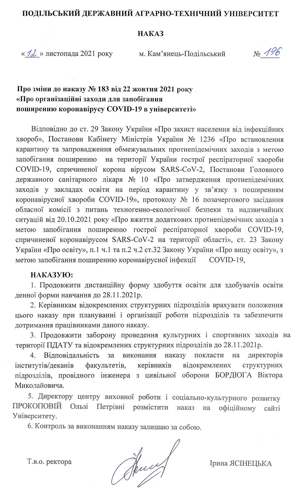 Наказ №196 «Про зміни до наказу № 183 від 22 жовтня 2021 року «Про організаційні заходи для запобігання поширенню коронавірусу COVID-19 в університеті»