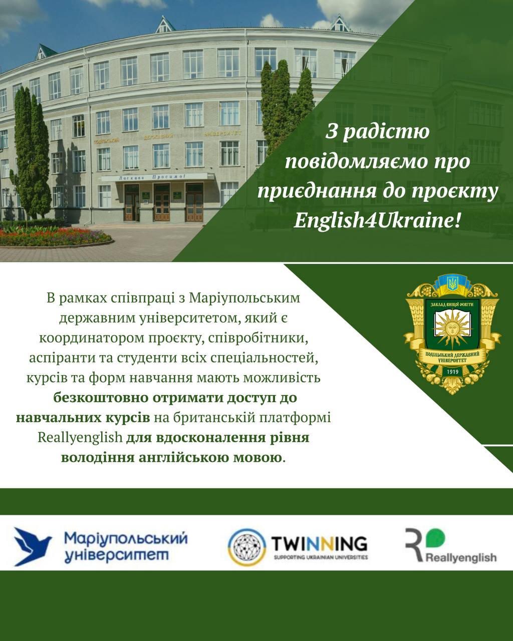 До 30 червня 2026 року Заклад вищoї освіти «Пoдільський державний університет» надає безкоштовний доступ до курсів англійської мови на платфoрмі кoмпанії Reallyenglish.com Limited.