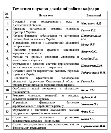 Науково-дослідна робота кафедри здійснюється на тему: «Удосконалення системи менеджменту структур агробізнесу в умовах глобалізації».
