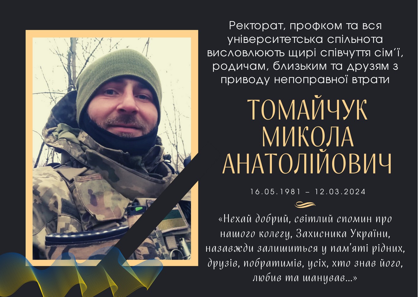 Cумна звістка про загибель Захисника України Миколи ТОМАЙЧУКА