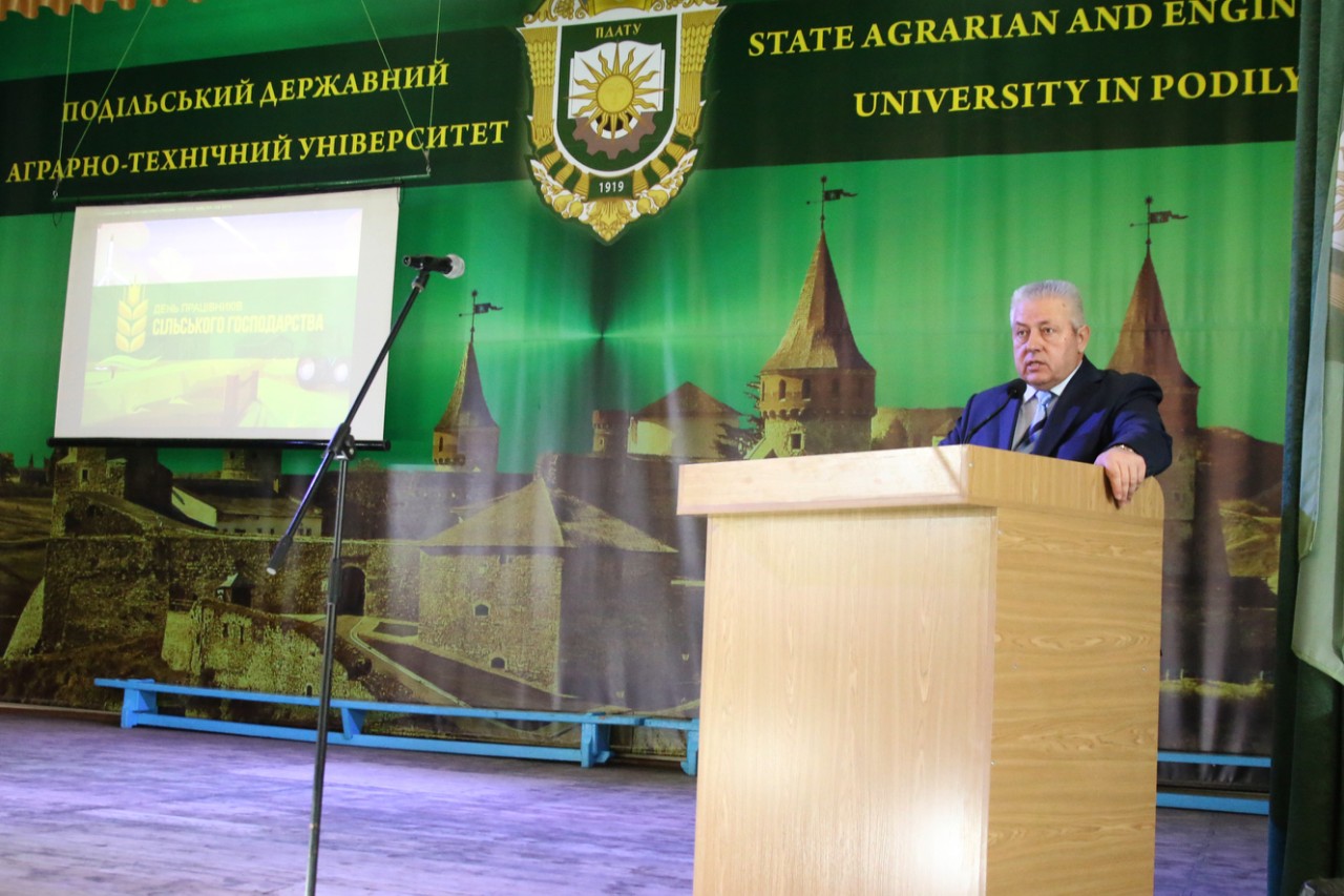 13 листопада 2019 р. у Подільському державному аграрно-технічному університеті відбулися урочисті заходи до Дня сільськогосподарських працівників. Це день, що традиційно підсумовує кропітку працю аграріїв, завершує хліборобський рік, сповнений хвилюваннями і турботами про врожай. Так, із вітальним словом до усіх присутніх, звернувся голова вченої ради, професор Володимир Іванишин, привітавши колектив Подільського державного аграрно-технічного університету, а також молодь із їхнім «професійним святом» - Днем студента. Володимир Васильович зазначив, що одне із завдань закладу вищої освіти для викладачів залишається незмінним – це науковий пошук та якісна підготовка кадрів для АПК. Завдання ж студентської молоді полягає у розвитку, сміливості крокувати вперед, захищаючи себе й своє право на гідне, щасливе життя, впевнено відкриваючи нові горизонти, залишаючись при цьому такими ж неповторними, енергійними й завзятими, здатними приймати неординарні рішення.