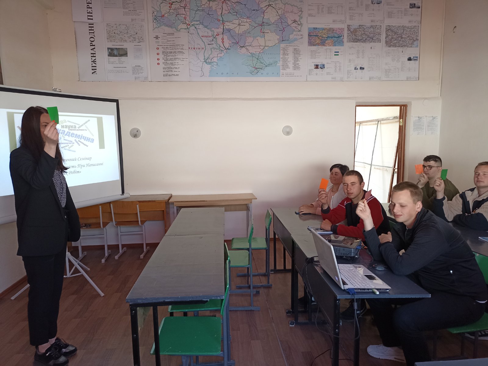 16 травня на інженерно-технічному факультеті ЗВО «ПДУ» в рамках Дня науки і Всесвітнього дня вишиванки відбувся науково-практичний семінар «Академічна доброчесність при написанні наукових робіт». Даний захід об’єднав учасників студентського наукового гуртка «Екологічна безпека та транспорт» спеціальності 275 «Транспортні технології (на автомобільному транспорті)» та здобувачів вищої освіти спеціальності 274 «Автомобільний транспорт» і 208 «Агроінженерія» з метою забезпечення формування високої культури в межах популяризації академічної доброчесності усіма учасниками освітнього процесу. Учасниками зібрання були розглянуті основні фундаментальні цінності, на яких базується академічна доброчесність: довіра, справедливість, чесність, повага, відповідальність та відвага до дій. Окрім того, усі бажаючі пройшли міні-тренінг з картками, який дозволив визначити власне ставлення до порушення норм академічної доброчесності, таких як: академічний плагіат, самоплагіат, списування, обман, фальсифікація, тощо.