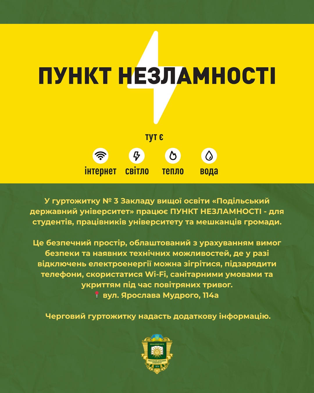 Пункт незламності розташований за адресою: вул. Ярослава Мудрого, 114а.