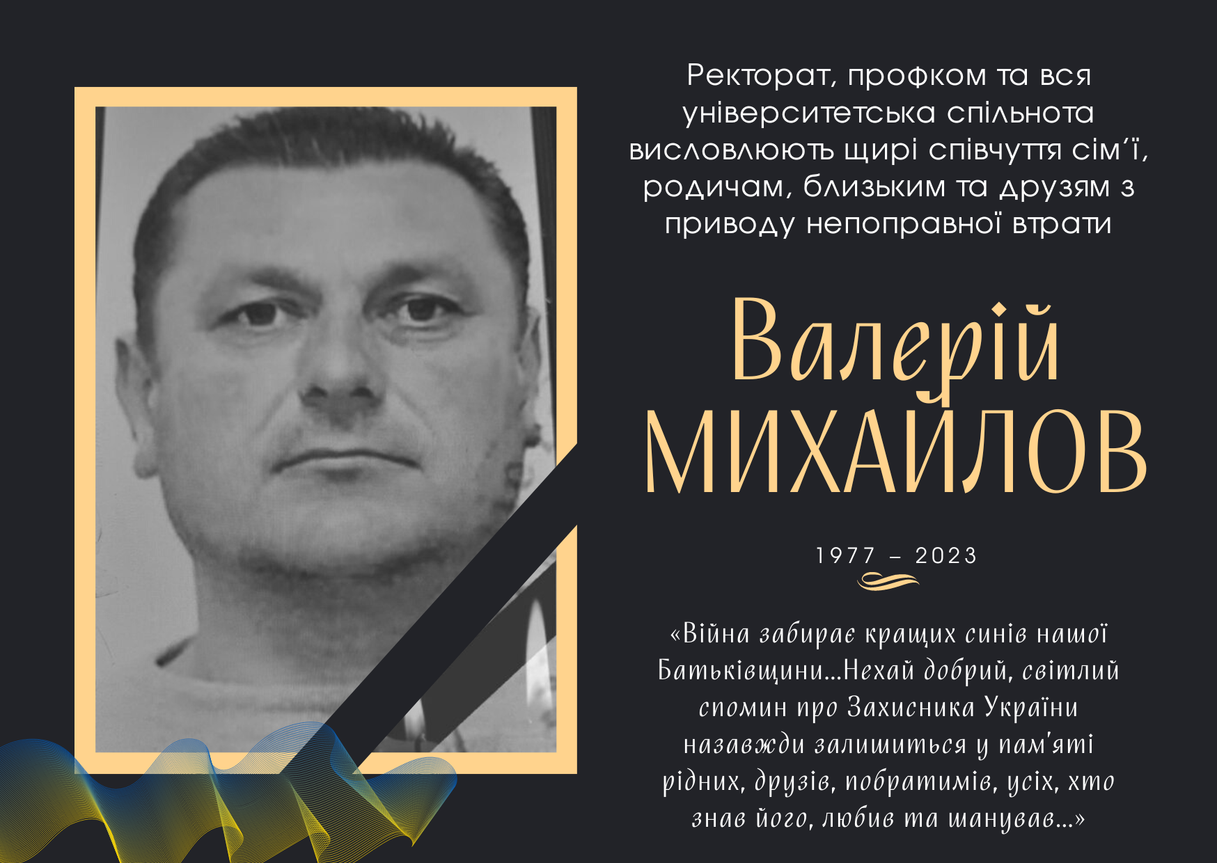 Ректорат, профком та вся університетська спільнота висловлюють щирі співчуття сім’ї, родичам, близьким та друзям з приводу непоправної втрати. Нехай добрий, світлий спомин про захисника України назавжди залишиться у пам’яті рідних, колег, усіх, хто знав його, любив та шанував.