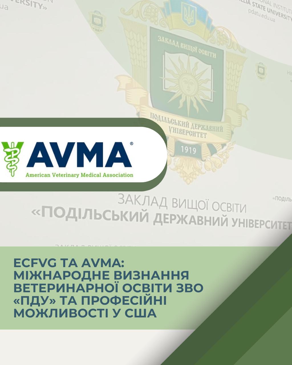 Заклад вищої освіти «Подільський державний університет» успішно пройшов сертифікацію в межах програми ECFVG (Educational Commission for Foreign Veterinary Graduates) та внесений Американською ветеринарною медичною асоціацією (AVMA) до переліку закладів вищої освіти, дипломи яких визнаються для подальшої процедури підтвердження у Сполучених Штатах Америки.