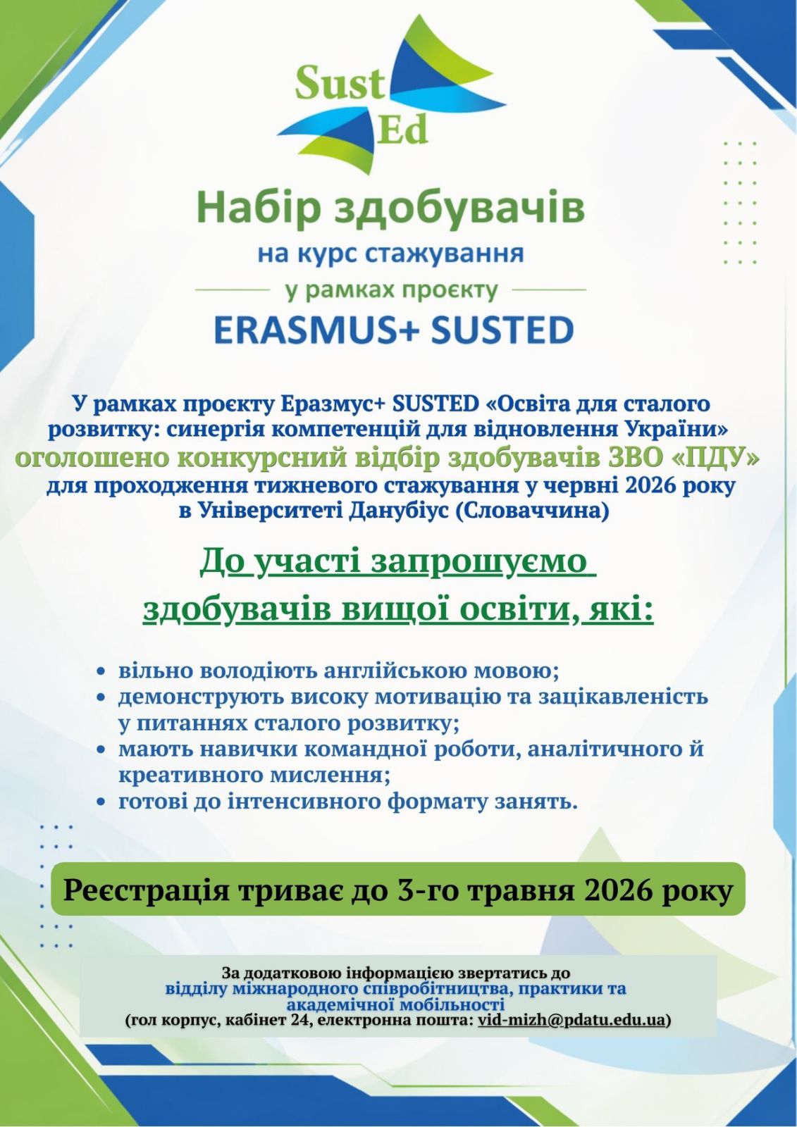 Набір здобувачів на курс стажування у рамках проєкту ERASMUS+ SUSTED