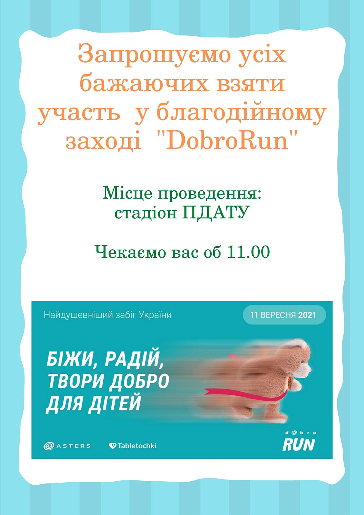 Подільський державний аграрно-технічний університет запрошує усіх бажаючих долучитись до Благодійного заходу DobroRun на підтримку онкохворих дітей на їхньому шляху до перемоги.