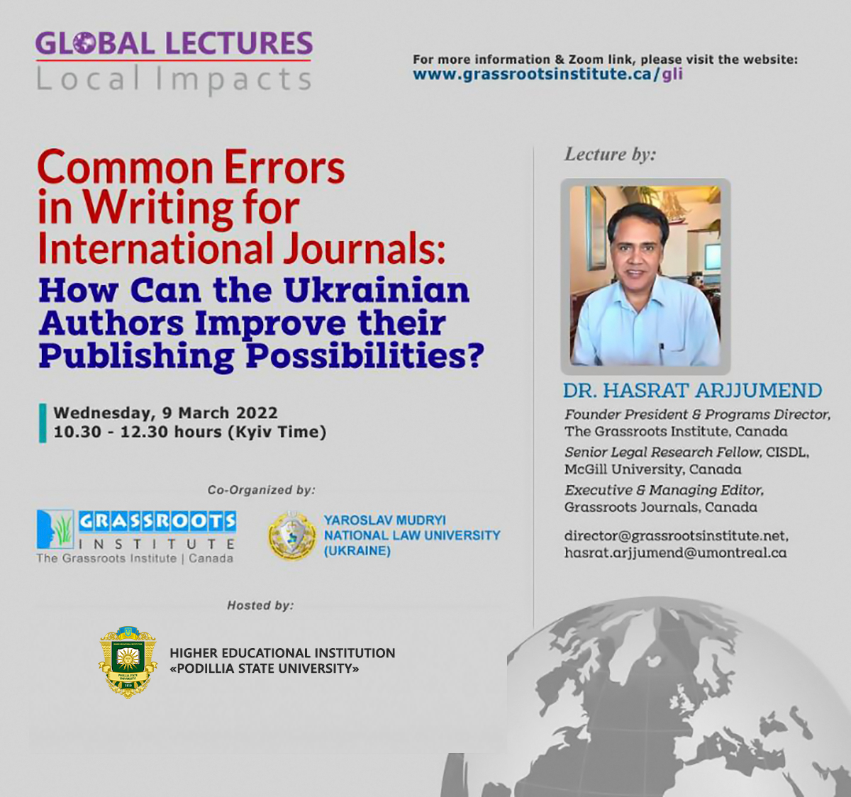 ЗВО «ПДУ» є Приймаючою стороною і запрошує вас на лекцію "Common Errors in Writing for International Journals: How Can the Ukrainian Authors Improve their Publishing Possibilities?" («Поширені помилки при написанні статей до міжнародних журналів: як українські автори можуть покращити свої видавничі можливості?»), запропоновану нашим партнером Grassroots Institute (Канада), одним із напрямів діяльності якого є видання наукових журналів із широкою міжнародною видимістю. У цій лекції Президент-засновник і програмний директор The Grassroots Institute доктор Хасрат Арджюменд (Dr. Hasrat Arjjumend), за інформаційної підтримки громадських інституцій та Закладу вищої освіти «Подільський державний університет» наочно продемонструє і обговорить, які типові помилки допускають українські автори в англійських написаних чи перекладених текстах. Лекція міститиме практичну компоненту, завдяки чому науковці, які пишуть, або перекладають англійською мовою рукописи, отримають рідкісні знання і зможуть покращити свої наступні праці перед подачею в міжнародні журнали на 50-75%.