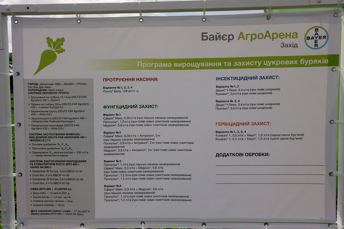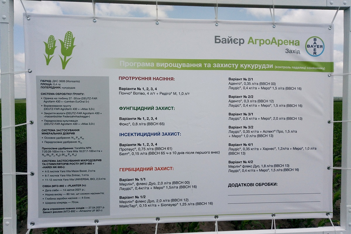 На агроарені можна було наочно побачити лінійку гібридів ріпаку бренду DEKALB®, різні системи захисту буряків, пшениці, кукурудзи від шкідників, хвороб та бур'янів. Також можна було побачити цікаві досліди з вивчення строків сівби гібридів ріпаку, кукурудзи, соняшнику, ефективності різних добрив та їх доз внесення при сівбі соняшнику та кукурудзи. Фахівці компанії ділились досвідом застосування своїх продуктів, відмічали найбільш ефективні системи захисту сільськогосподарських культур від шкодочинних об'єктів.