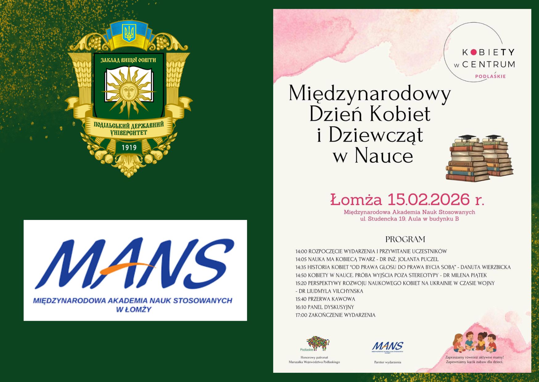 15 лютого 2026 року на базі Międzynarodowa Akademia Nauk Stosowanych (MANS) у місті Łomża відбувся міжнародний захід з нагоди Міжнародного дня жінок і дівчат у науці, організований у співпраці з Kobiety w Centrum Podlaskie. Захід пройшов у дистанційному форматі на платформі Teams та об’єднав науковиць і науковців із різних країн для обговорення ролі жінки в сучасному науковому просторі.