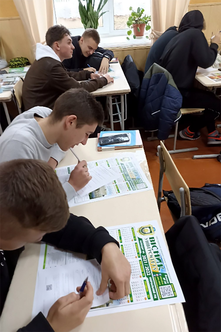 Спілкування відбулось змістовно: були наведені переваги вступу і навчання у ПДУ, як провідного аграрного ВИШу у регіоні, що було представлено в презентації, аргументовано в усному спілкуванні. Учнями 11 класу були заповнені анкети з профорієнтаційною метою. В основному було виявлено бажання вступати на спеціальність Агрономія (4 з 18 присутніх).