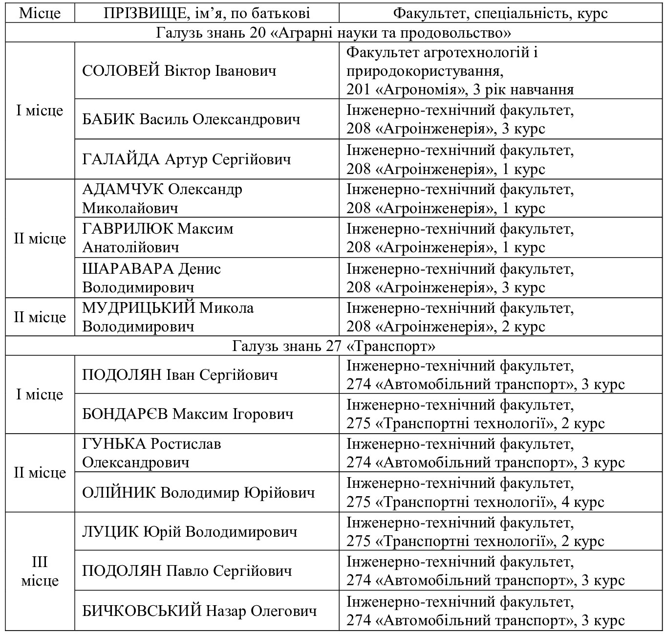 Згідно з листом Міністерства освіти і науки України № 3/6722-24 від 27.09.2024 року і листа Державної наукової установи «Інститут модернізації змісту освіти» № 21/08-1610 від 02.10.2024 року щодо проведення Всеукраїнського конкурсу студентських наукових робіт з галузей знань і спеціальностей у 2024-2025 навчальному році, відповідно до положення про Всеукраїнський конкурс студентських наукових робіт з галузей знань і спеціальностей, затвердженого наказом Міністерства освіти і науки України від 18.04.2017 року № 605, зареєстрованого в Міністерстві юстиції України 15.05.2017 року за № 620/30488, Додатком до наказу Міністерства освіти і науки України від 24.11.2020 № 1457 щодо галузей знань, спеціальностей, з яких проводиться Конкурс, а також згідно Наказу Закладу вищої освіти «Подільський державний університет» від 30 жовтня 2024 року № 215, кафедрами агроінженерії і системотехніки імені Михайла Самокиша, технічного сервісу і загальнотехнічних дисциплін 10 квітня 2025 року, а кафедрами тракторів, автомобілів та енергетичних засобів, транспортних технологій та засобів АПК 15 квітня 2025 року проведено перший тур Всеукраїнського конкурсу студентських наукових робіт зі спеціальностей 208 «Агроінженерія», 274 «Автомобільний транспорт», 275 «Транспортні технології (на автомобільному транспорті)».