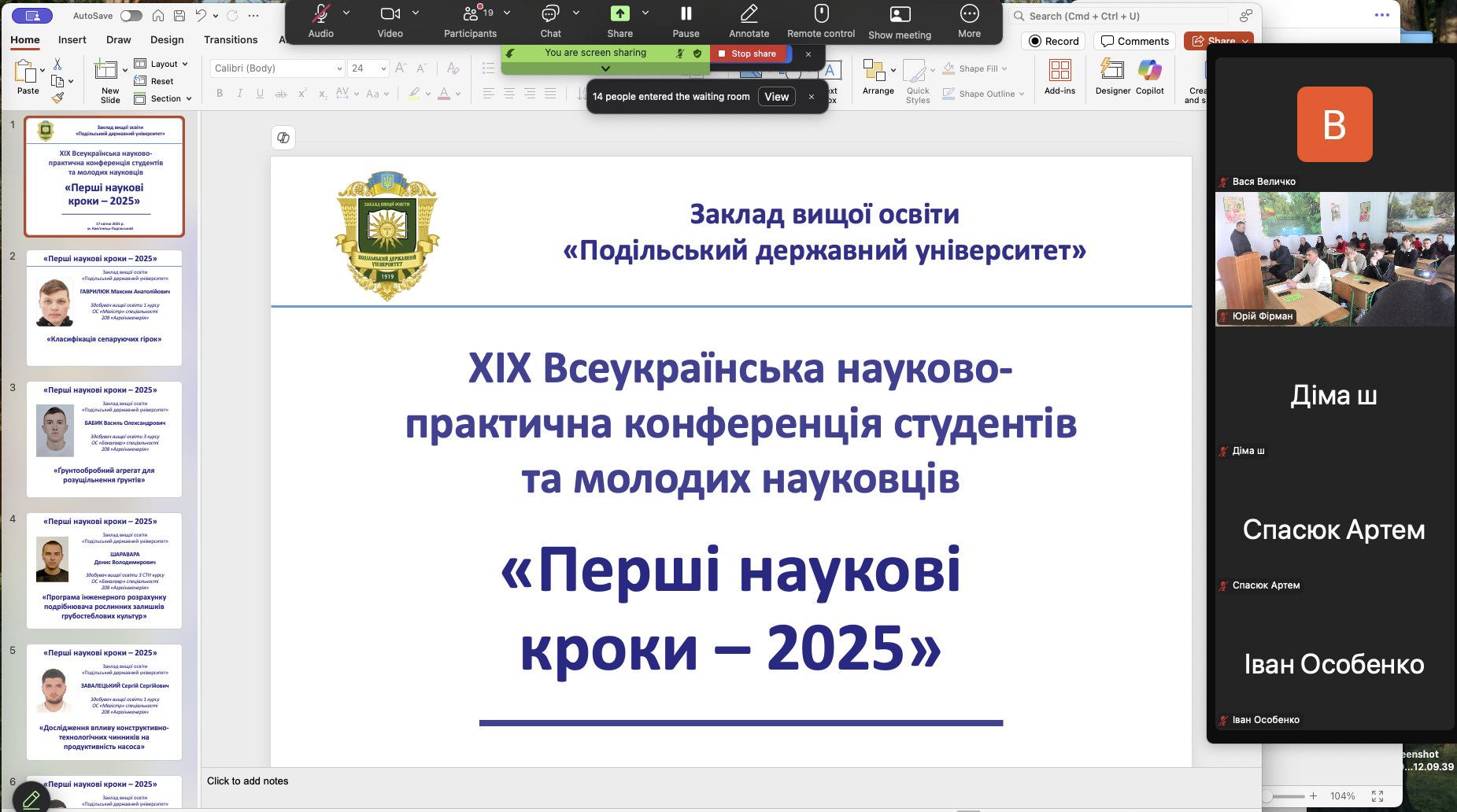 З метою розвитку науково-дослідної діяльності серед студентської молоді, стимулювання їхньої наукової ініціативи, а також формування навичок публічних виступів 17 квітня 2025 року на інженерно-технічному факультеті Закладу вищої освіти «Подільський державний університет» успішно відбулася щорічна ХІХ Всеукраїнська студентська науково-практична конференція студентів та молодих науковців «Перші наукові кроки – 2025», яка об’єднала талановиту молодь, викладачів та науковців у спільному обговоренні актуальних проблем сучасної науки та практики.