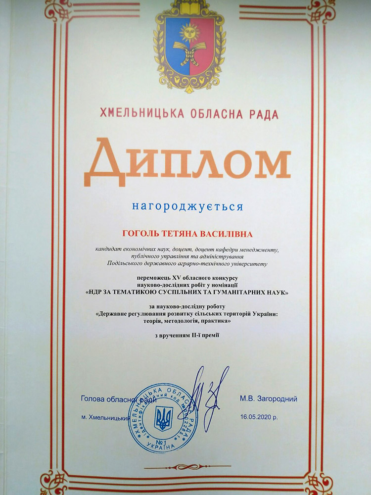 Відповідно до розпорядження голови Хмельницької обласної ради Михайла Васильовича Загородного кандидата економічних наук, доцента кафедри менеджменту, публічного управління та адміністрування університету Гоголь Тетяну Василівну визнано переможницею ХV обласного конкурсу науково-дослідних робіт (друга премія) в номінації «Науково-дослідні роботи за тематикою суспільних та гуманітарних наук», тема науково-дослідної роботи: «Державне регулювання розвитку сільських територій України: теорія, методологія, практика».