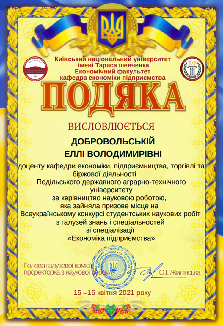 Відповідно до наказу Міністерства освіти і науки України від 24.11.2020 № 1457 протягом квітня 2021 р. на базі закладів вищої освіти України відбувся ІІ тур Всеукраїнських конкурсів студентських наукових робіт з відповідних спеціальностей. Конкурси було проведено в режимі онлайн-конференцій з дотриманням законодавства у частині запобігання поширенню на території України гострої респіраторної хвороби COVID-19, спричиненої коронавірусом SARS-CoV-2. Творча та активна молодь Подільського державного аграрно-технічного університету проявила високий рівень володіння навчальним матеріалом та наукової підготовки. Здобувачі вищої освіти під керівництвом досвідчених наукових керівників, професорів та доцентів економічного факультету ПДАТУ подали наукові роботи, які здобули перемогу на конкурсах: