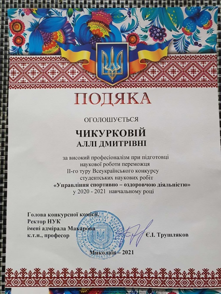 6 квітня 2021 року на базі Національного університету кораблебудування імені адмірала Макарова відбувся ІІ етап Всеукраїнського конкурсу студентських наукових робіт зі спеціалізації «Управління спортивно-оздоровчою діяльністю». З науковою доповіддю економічний факультет Подільського державного аграрно-технічного університету успішно представляв студент магістратури Буркацький Артем Юрійович (науковий керівник д-р. екон. наук, професор Чикуркова Алла Дмитрівна). Тема наукової роботи «Управління розвитком курортної діяльності в Україні». Студент здобув диплом ІІ ступеня.