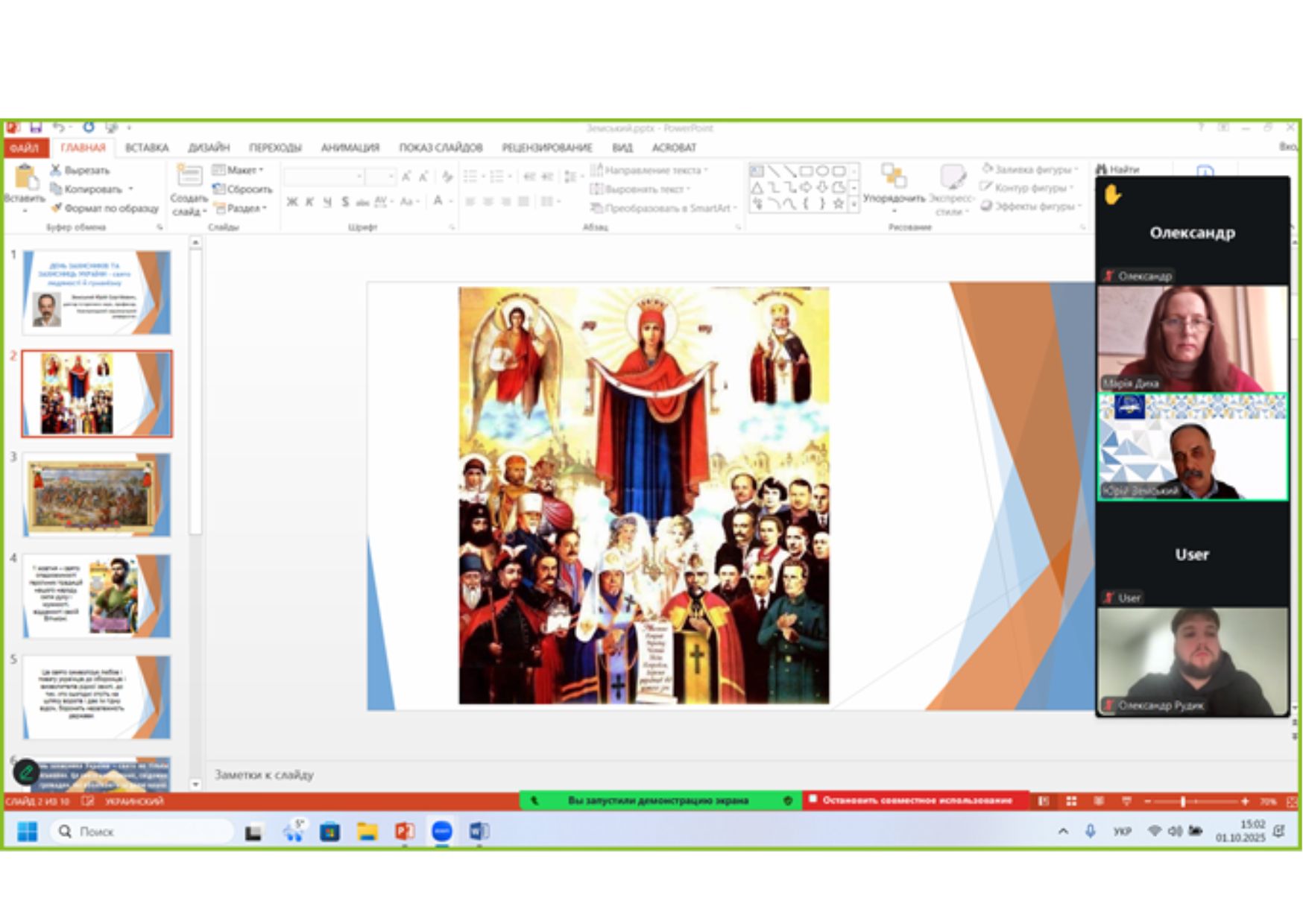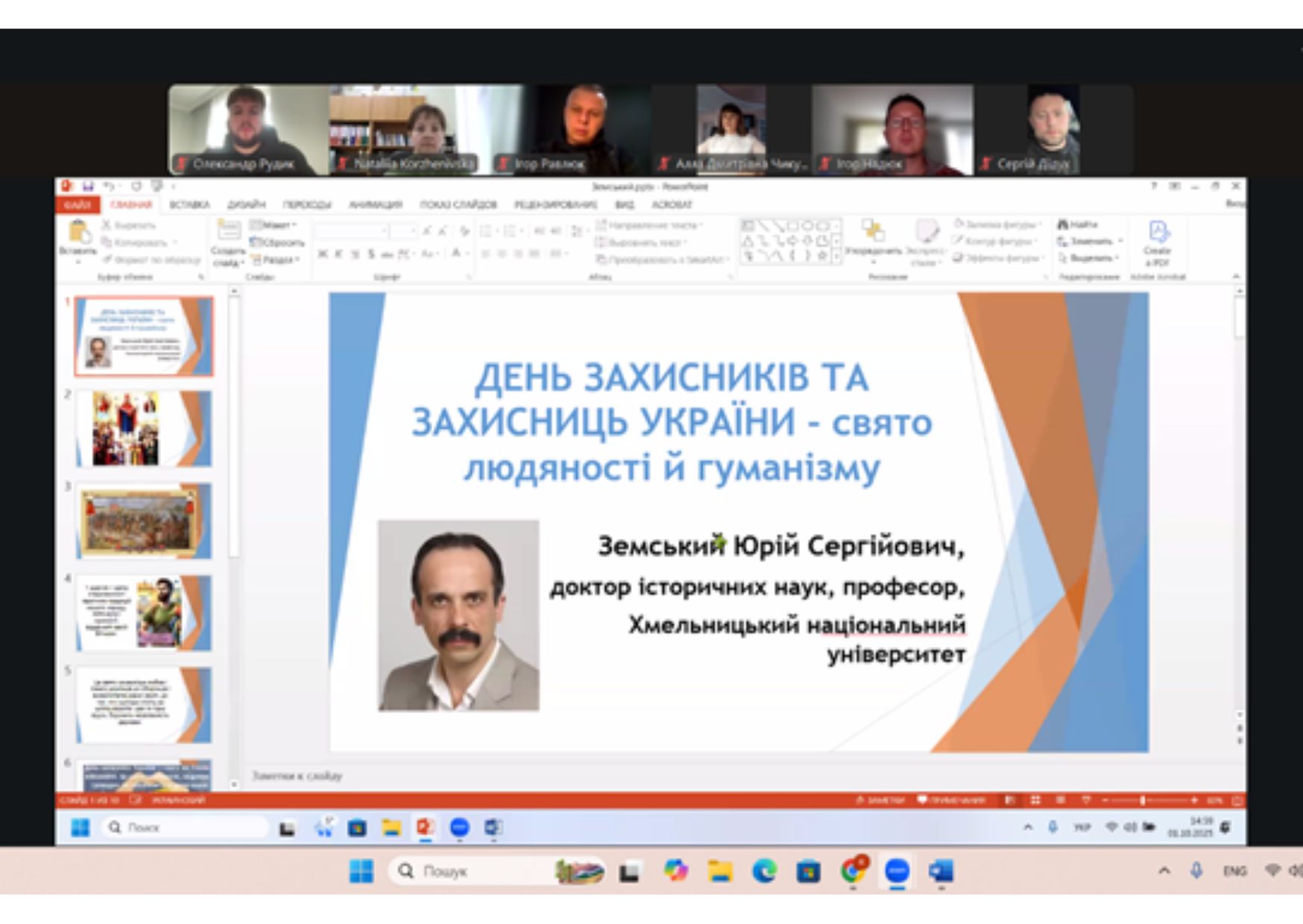 Змістовним і пізнавальним для наших аспірантів був виступ Юрія ЗЕМСЬКОГО, д.іст.н., проф. (Хмельницький національний університет), який представив доповідь на тему: «ДЕНЬ ЗАХИСНИКІВ ТА ЗАХИСНИЦЬ УКРАЇНИ – свято людяності й гуманізму». Доповідач звернув увагу на роль українського козацтва в історії України. Діяльність козаків торкалася всіх сфер життя українського народу: вони боронили українські землі, освоювали південні степи, підтримували українську культуру і православну церкву, брали участь в антифеодальних виступах, зробили головний внесок у визволення з України з-під влади Речі Посполитої.