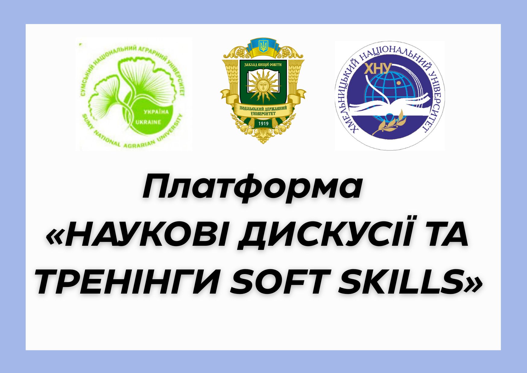 Платформа «НАУКОВІ ДИСКУСІЇ ТА ТРЕНІНГИ SOFT SKILLS», яка функціонує у Хмельницькому національному університеті (керівник Марія ДИХА, д-р екон., наук, професор), створена з метою розвитку у здобувачів вищої освіти навичок комунікації, командної роботи, креативності та інших надпрофесійних компетенцій, необхідних для успіху в кар'єрі.