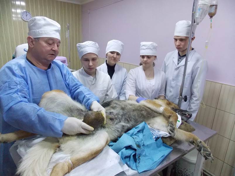 Спочатку гуртківці обговорили теоретичні аспекти даної патології, з якими ознайомилися попередньо. Згідно останніх повідомлень онкологів, рак молочної залози - це найпоширеніша форма раку в світі як в людей, так і самок тварин. Досить поширена – це м’яко сказано, адже пухлини молочних залоз займають чільне місце за частотою, що характеризуються несприятливим прогнозом. Серед тварин до цієї патології найбільш чутливі суки та кішки, а саме некастровані тварини віком від п’яти років. На початкових етапах утворення пухлини проходить безболісно і практично безсимптомно, тому рідко діагностується на ранніх стадіях. Згідно з дослідженнями науковців та практиків ризик розвитку пухлин молочних залоз суттєво знижується у разі, якщо самка кастрована до першої тічки. Це поліетіологічне захворювання, тобто його розвиток пов’язаний із впливом різних факторів, серед яких генетичний чинник та гормонотерапія посідають перше місце. Оперативне втручання у 12-річної німецької вівчарки розпочинали із збору анамнезу та клінічного дослідження тварини. Визначили коли з’явилася пухлина, з’ясували чим хворіла тварина, перевірили основні клінічні показники. Урахували можливі ускладнення під час операції та можливість виникнення післяопераційних ускладнень. Акцентовано, що можливість проведення оперативного втручання вирішує не вік тварини, а функціональний стан органів та систем організму. У результаті обстеження встановили, що операцію можна провести під загальним наркозом, доповнивши її місцевою анестезією.