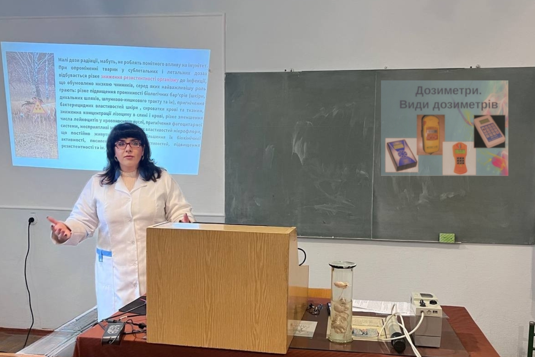 Важливим елементом теоретичної частини заходу стала доповідь студентки Каріни БЕБЕХ на тему «Сучасні дозиметри». Вона детально розкрила можливості та принципи роботи новітніх пристроїв, які використовуються для моніторингу радіаційної безпеки.