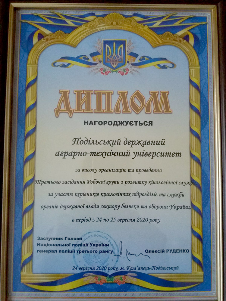 Начальник Відділу організації кінологічної діяльності Національної поліції України Світлана Коломієць за дорученням Заступника Голови Національної поліції України , генерала поліції третього рангу Олексія Руденка вручила Диплом, яким нагороджено Подільський державний аграрно-технічний університет за високу організацію та проведення Третього засідання Робочої групи з розвитку кінологічної служби за участю керівників кінологічних підрозділів та служб органів державної влади сектору безпеки та оборони України.