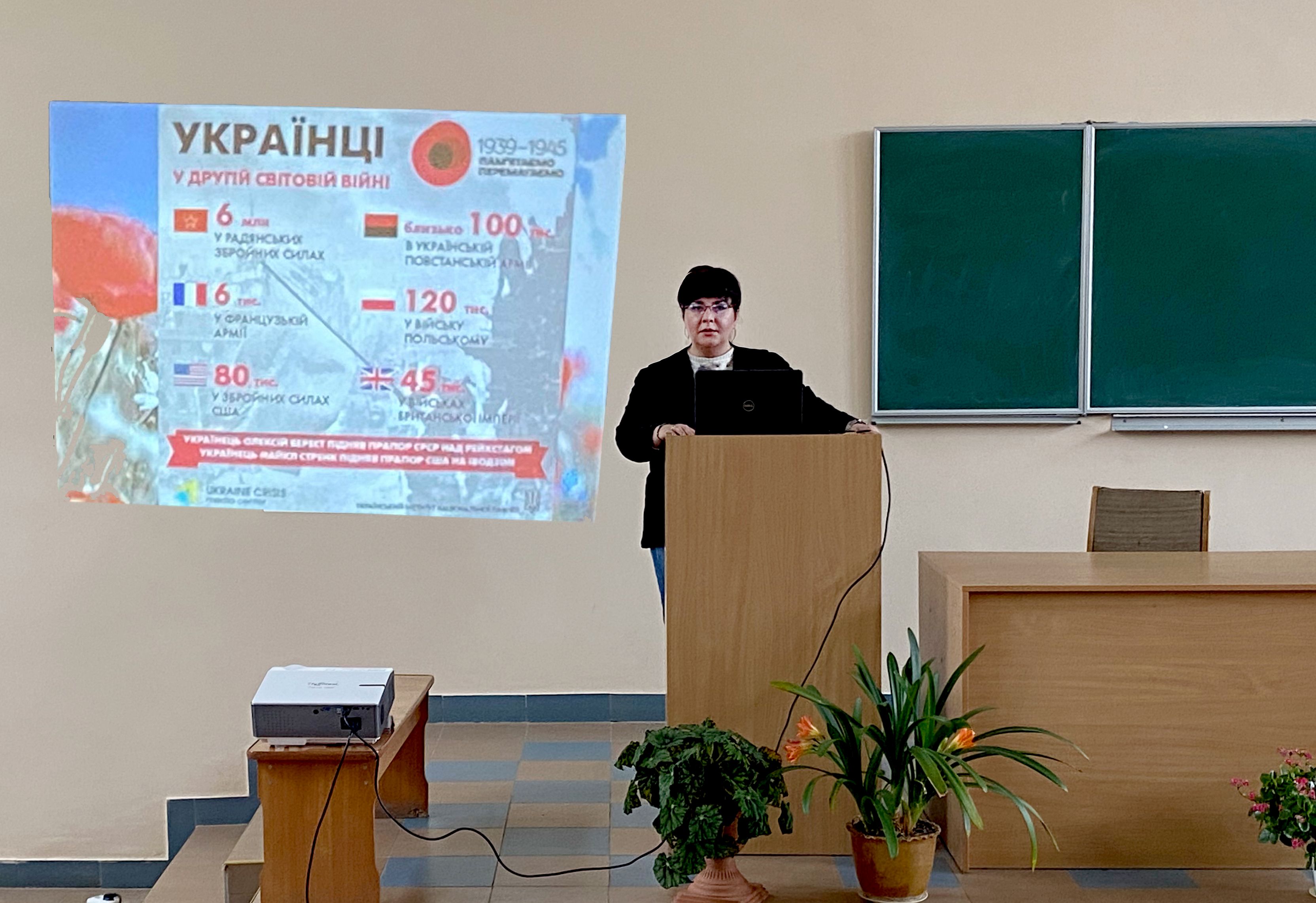 Науковиця й викладачка, докторка сільськогосподарських наук Тетяна СУПРОВИЧ, розповіла про долю українського народу в роки Другої світової, акцентуючи на тому, як війна зруйнувала долі мільйонів людей, і якою ціною була здобута перемога над нацизмом.