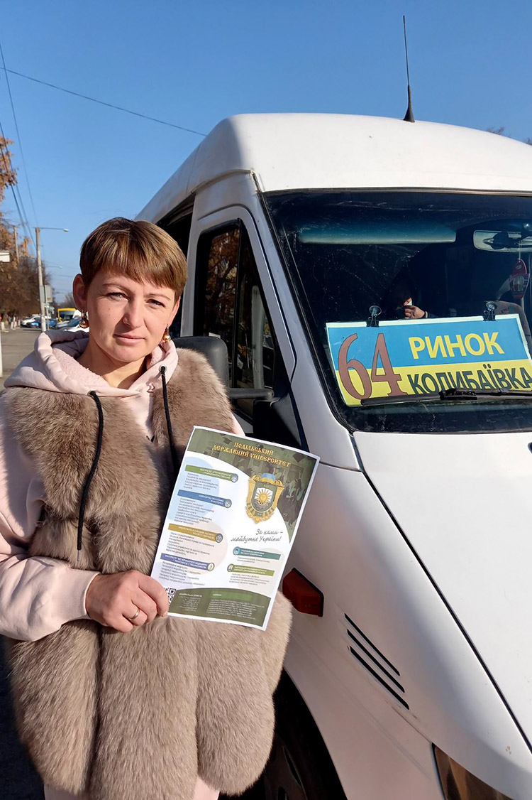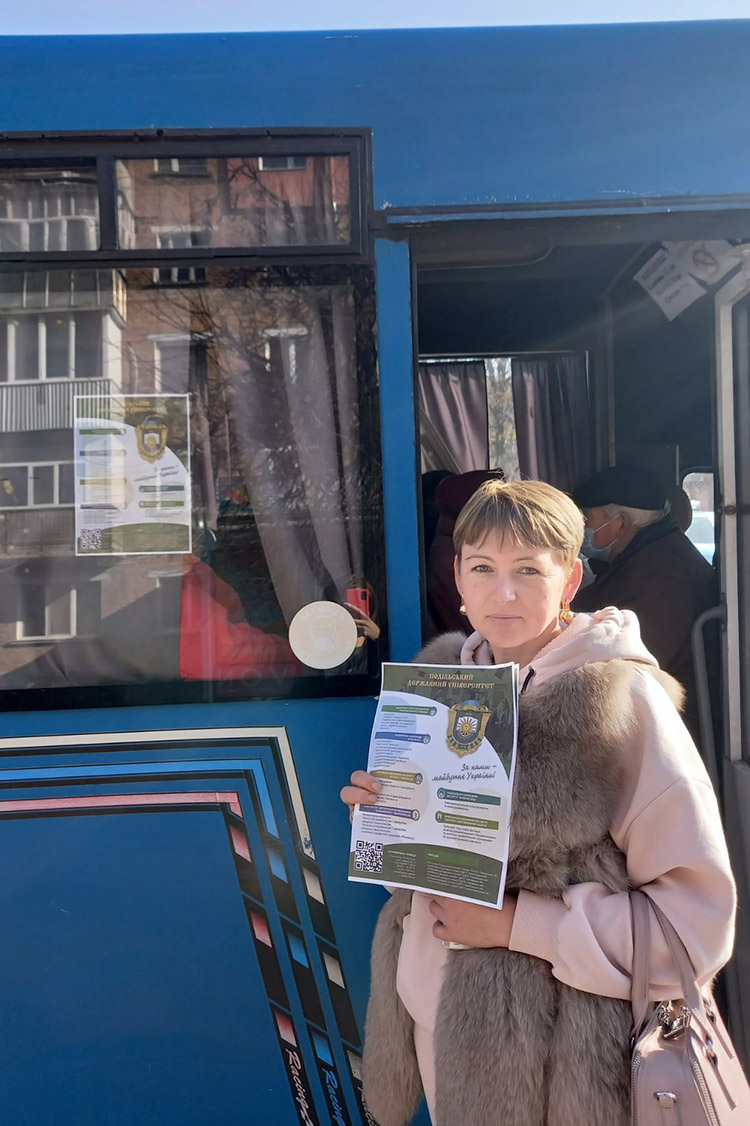 Науково-педагогічні працівники кафедри ветеринарного акушерства, внутрішньої патології та хірургії ПДАТУ продовжують проводити профорієнтаційну роботу у різний спосіб. Так, зокрема кандидат ветеринарних наук, доцент Захарова Тетяна Володимирівна, як і в минулі роки організувала рекламно-інформаційну діяльність у маршрутних таксі.