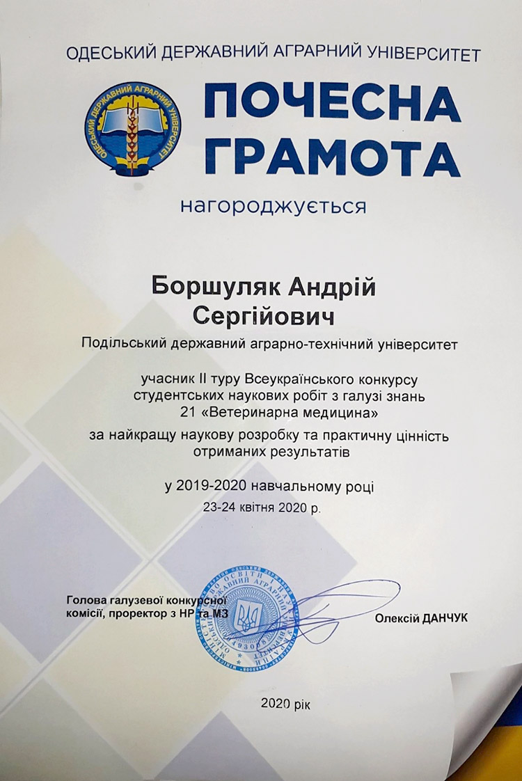 За результатами ІІ туру Всеукраїнського конкурсу студентських наукових робіт з галузі знань 21 «Ветеринарна медицина» спеціальності 211 «Ветеринарна медицина», який проходив в Одеському державному аграрному університеті, студент 3 курсу факультету ветеринарної медицини і технологій у тваринництві Подільського державного аграрно-технічного університету Боршуляк Андрій Сергійович був відзначений почесною грамотою за найкращу наукову розробку та практичну цінність отриманих результатів у 2019-2020 навчальному році. Науковий керівник – кандидат ветеринарних наук Трач Вячеслав Володимирович.