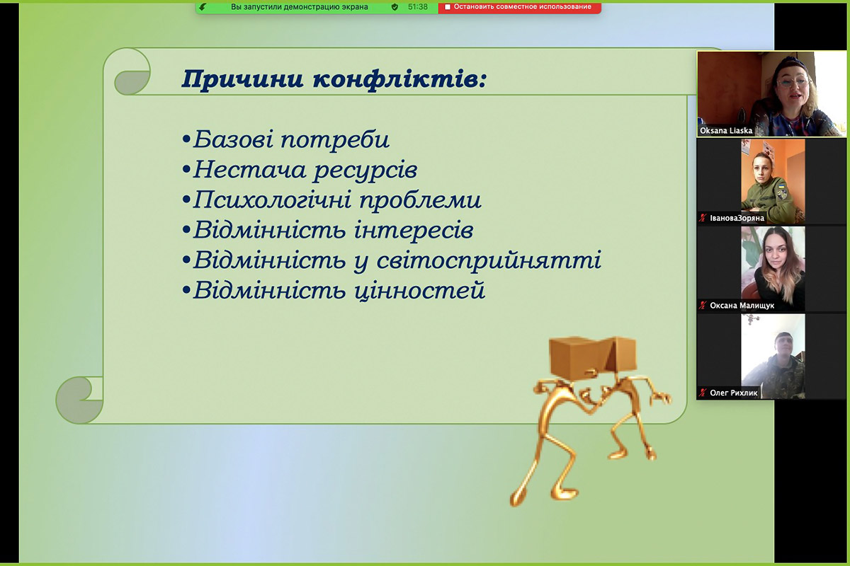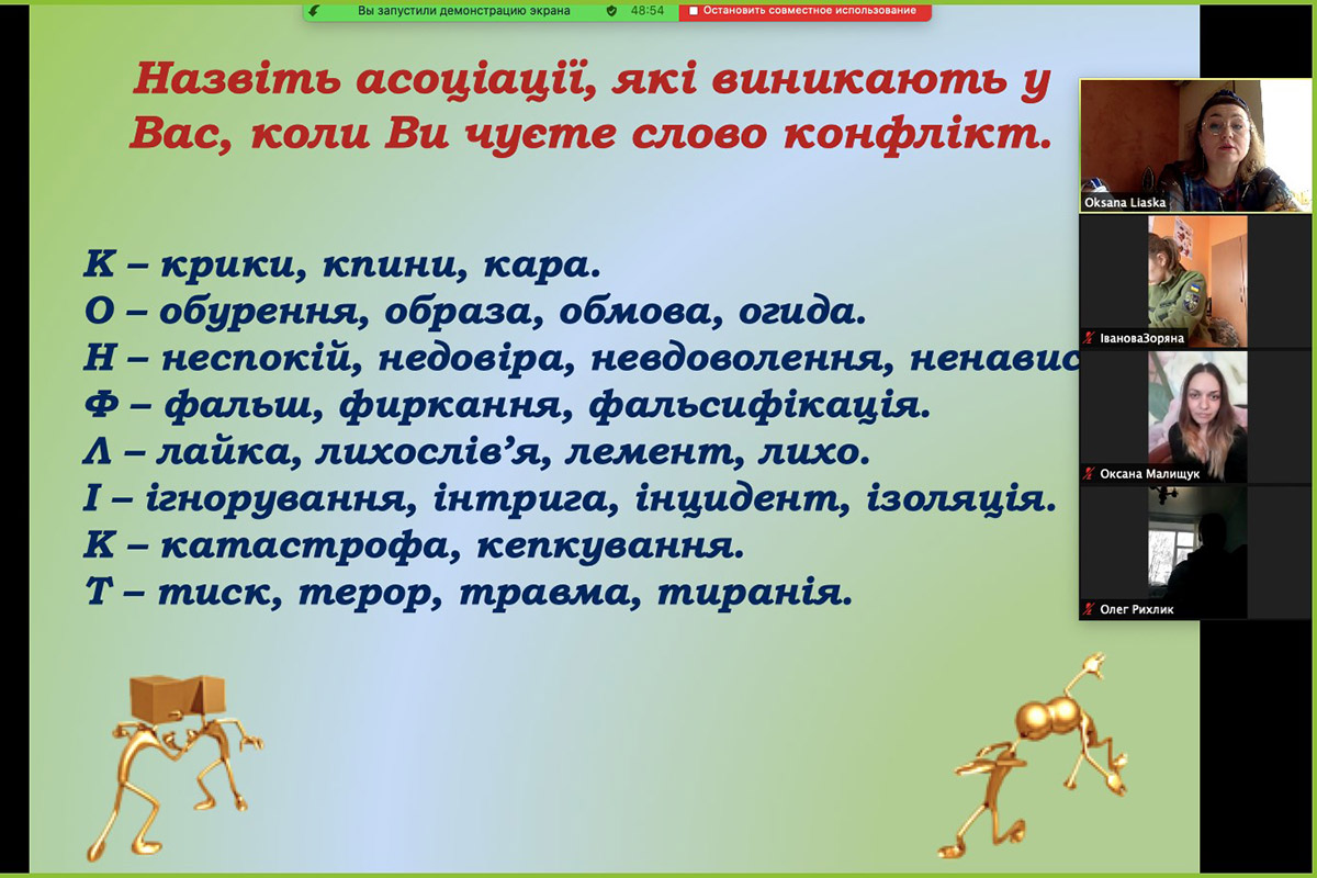 Впродовж діалогічної взаємодії, яка була присвячена темі «Суть конфлікту і причини його виникнення», створено позитивну атмосферу у групі, досягнуто емоційний комфорт учасників заняття, відбулося налаштування на плідну роботу, слухачі побачили себе зі сторони, зрозуміли свою поведінку в конфлікті, усвідомили, що конфлікт є нормою життя, яка має свої позитивні сторони.