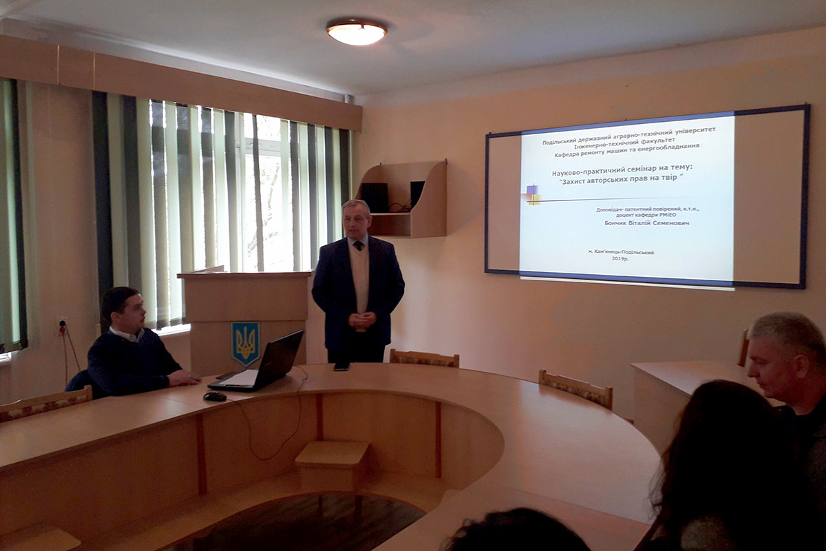 Виступаючи перед учасниками тренінг-навчання, доцент кафедри РМіЕО, представник у справах з інтелектуальної власності Бончик В.С., зупинився на питаннях дотримання основних вимог чинного законодавства при захисті авторських прав на методичні матеріали.