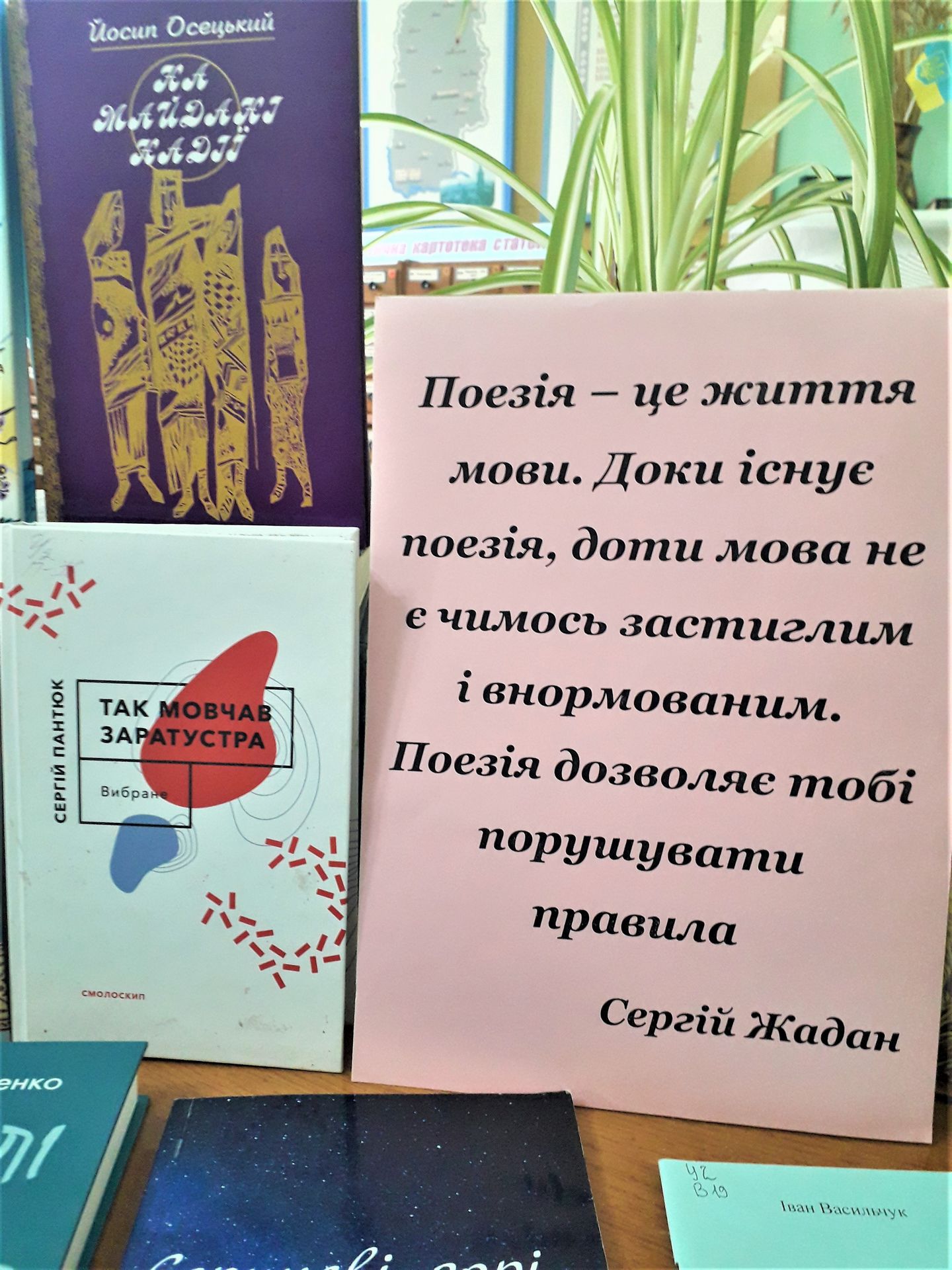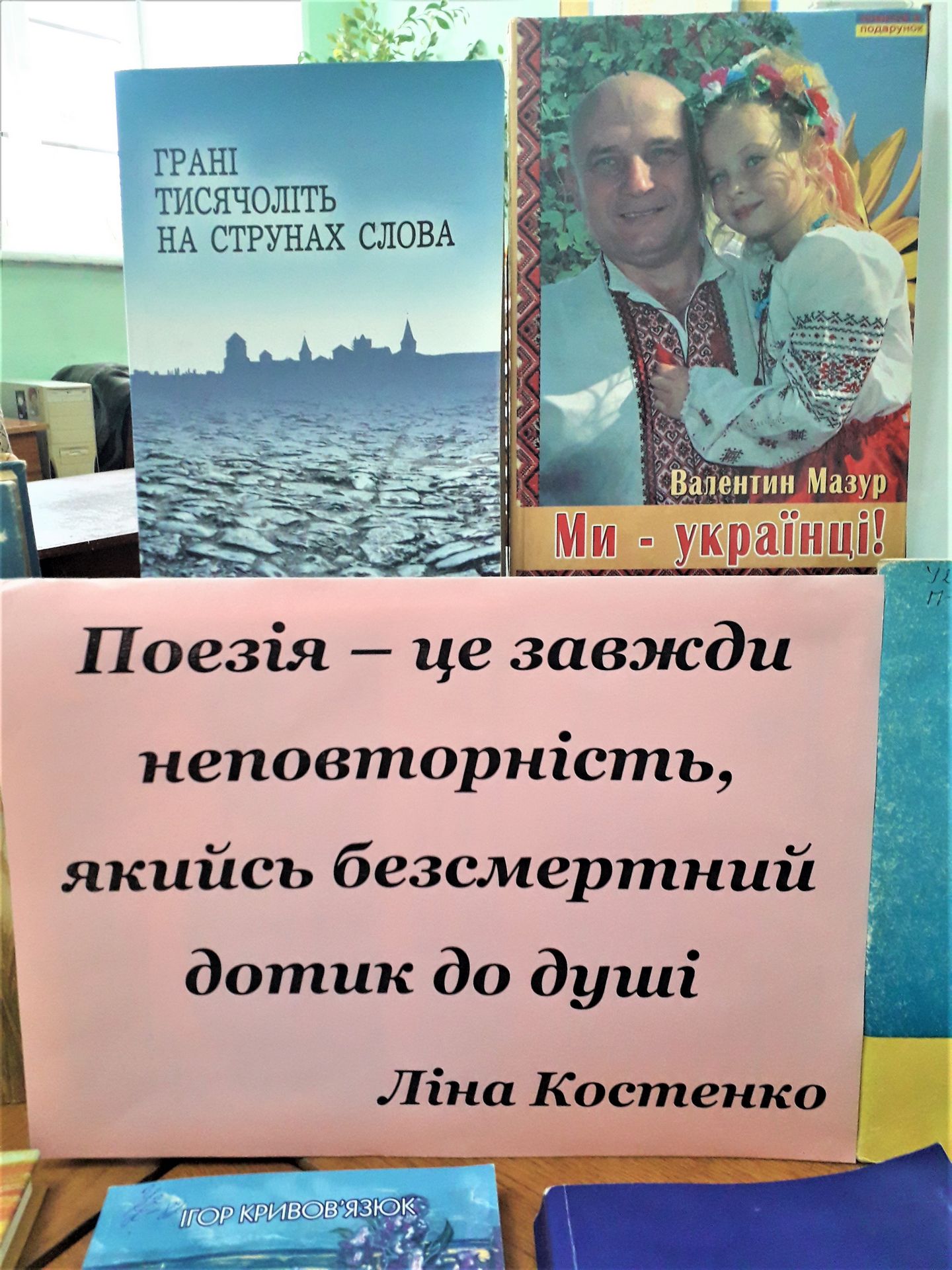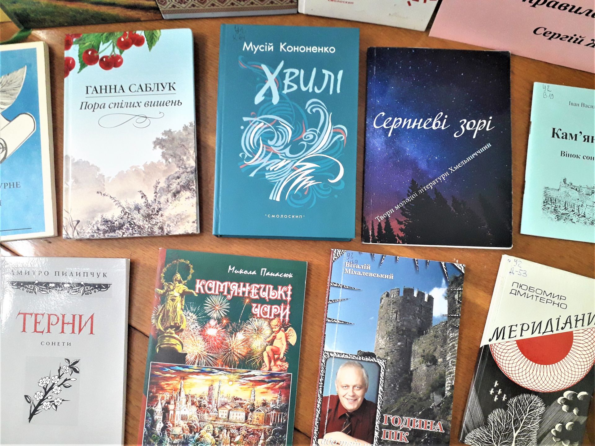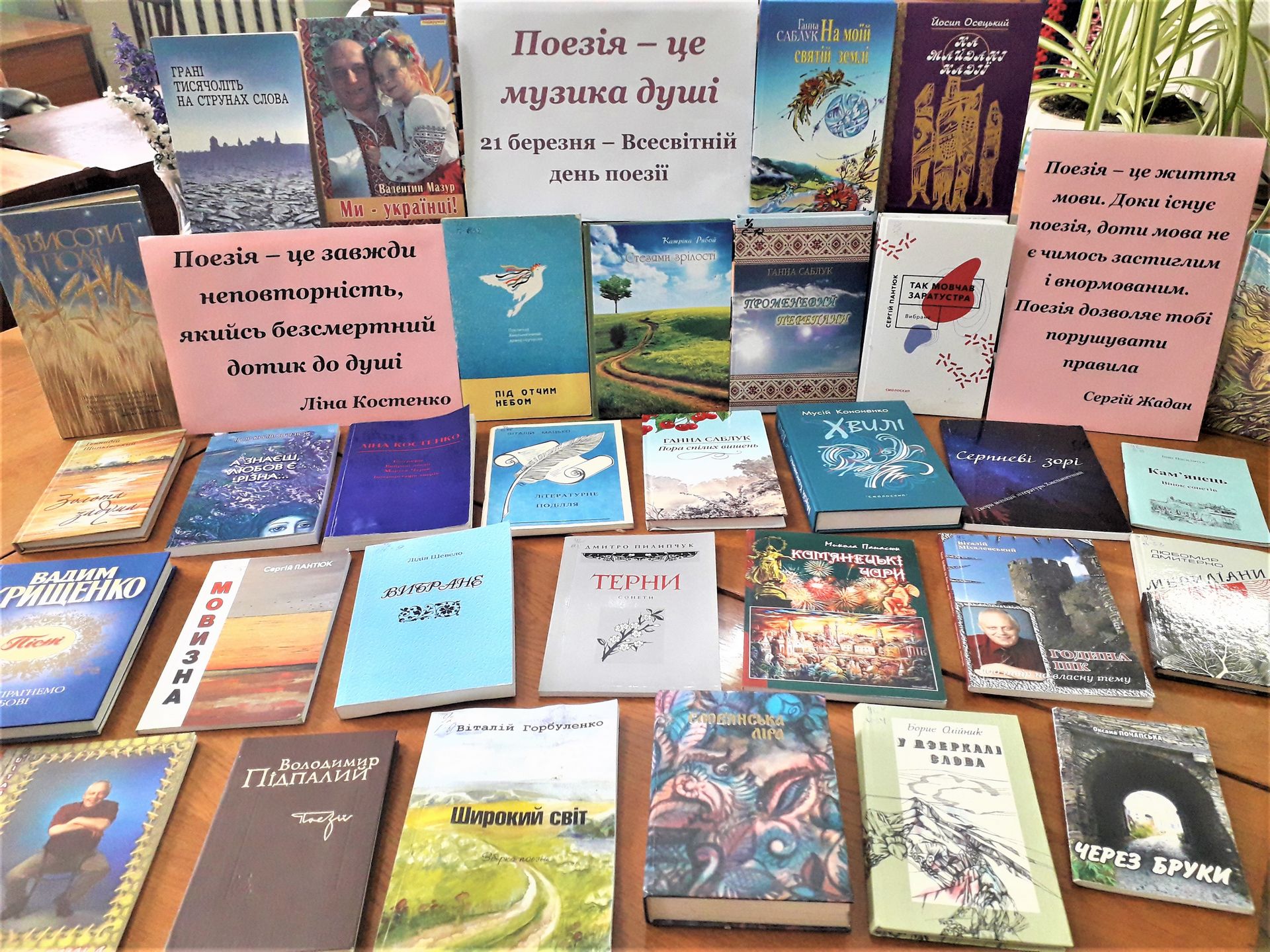 До Всесвітнього дня поезії в Науковій бібліотеці підготовлено тематичну книжкову виставку «Поезія – це музика душі». На виставці експонуються збірки відомих українських поетів, серед яких є творчі доробки поетів Хмельниччини. Представлена література ознайомить відвідувачів книгозбірні з ліричними сонетами Ліни Костенко, Миколи Вінграновського, Бориса Олійника, Любомира Дмитерка, Катріни Рябой, Ганни Саблук, Сергія Пантюка, Оксани Почапської, Вадима Крищенка, Лідії Шевело, Геннадія Щипківського, Миколи Панасюка, Віталія Міхалевського, Йосипа Осецького та ін.
