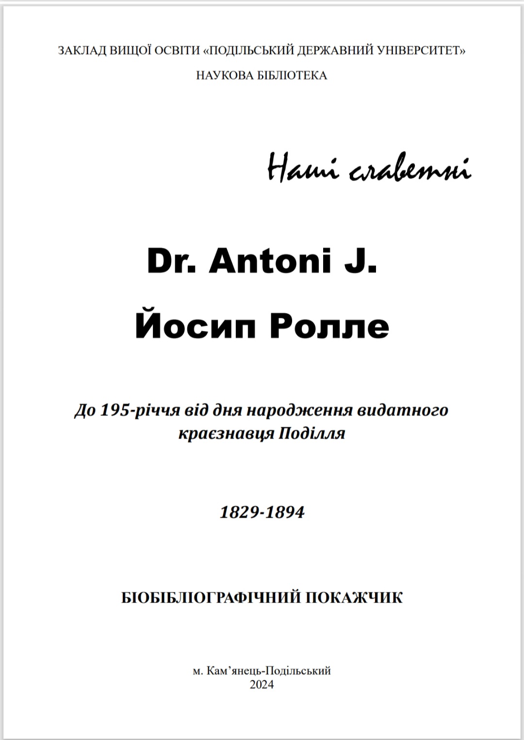 Біобібліографічний покажчик «Dr. Antoni J. – Йосип Ролле : до 195-річчя від дня народження видатного краєзнавця Поділля 1829-1894»