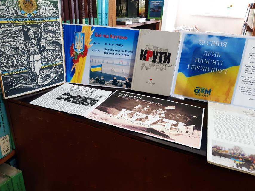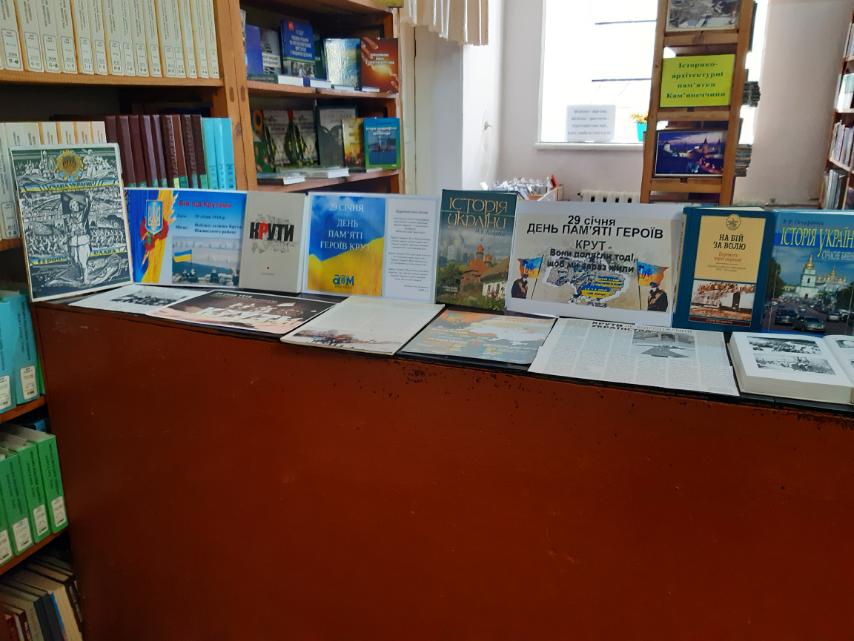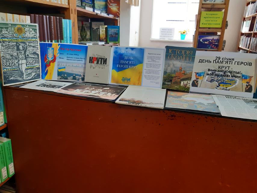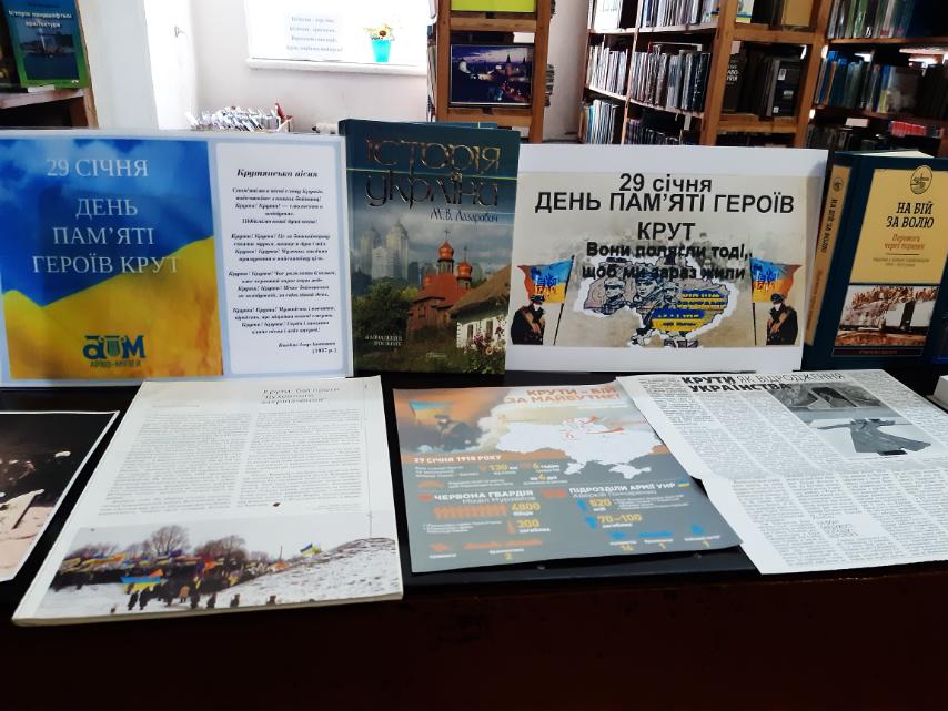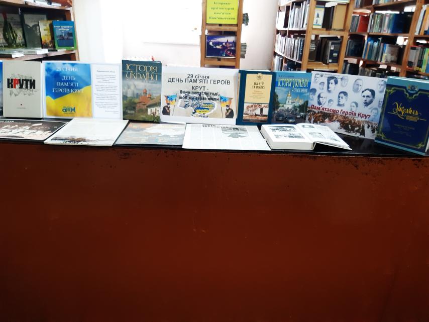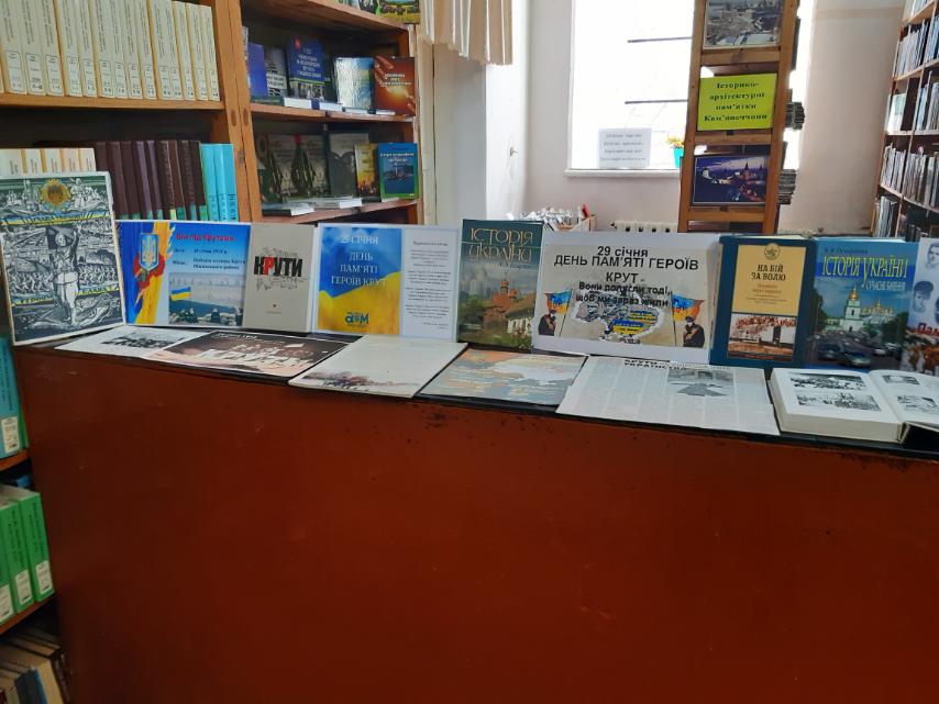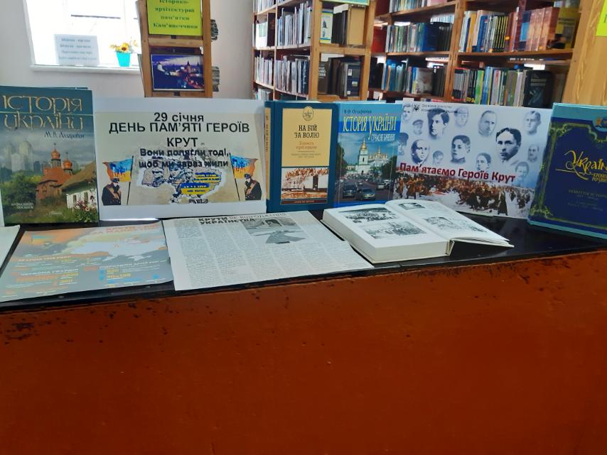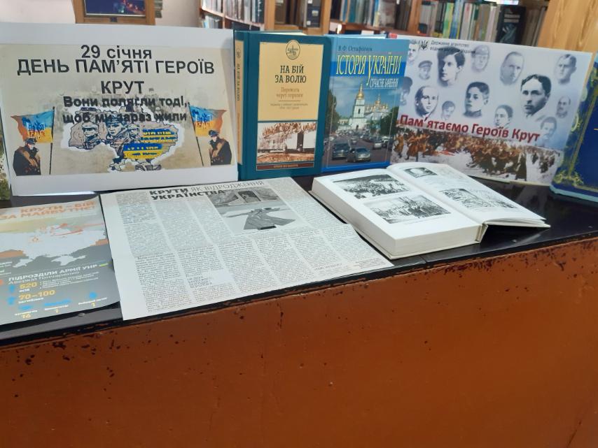 З нагоди вшанування пам’яті Героїв Крут бібліотекаркою Наталією Мазур підготовлено тематичну книжкову виставку-пам’ять. Мета виставки розкрити причини трагедії під Крутами, виховати в молодого покоління інтерес і повагу до історичного минулого своєї країни, до борців за незалежність України. На виставці представлені книги, публікації, фотоматеріали та художня література, присвячена подіям 1918 року. Дія виставки з 26.01.2025 р. до 31.01.2025 р. З експозицією можна ознайомитись на абонементі навчальної літератури.
