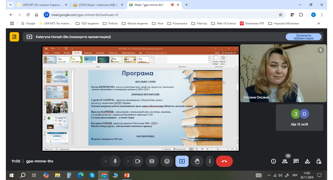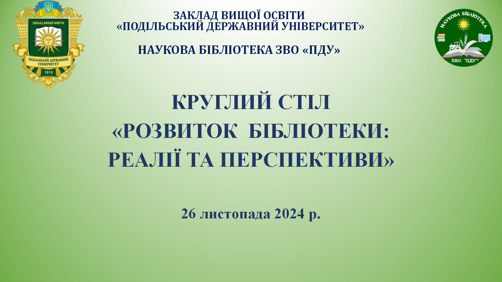 26 листопада 2024 року працівниками Наукової бібліотеки Закладу вищої освіти «Подільський державний університет» було організовано та проведено круглий стіл «РОЗВИТОК БІБЛІОТЕКИ: РЕАЛІЇ ТА ПЕРСПЕКТИВИ» (за змішаною формою участі on-line/of-line на платформі Google Meet).