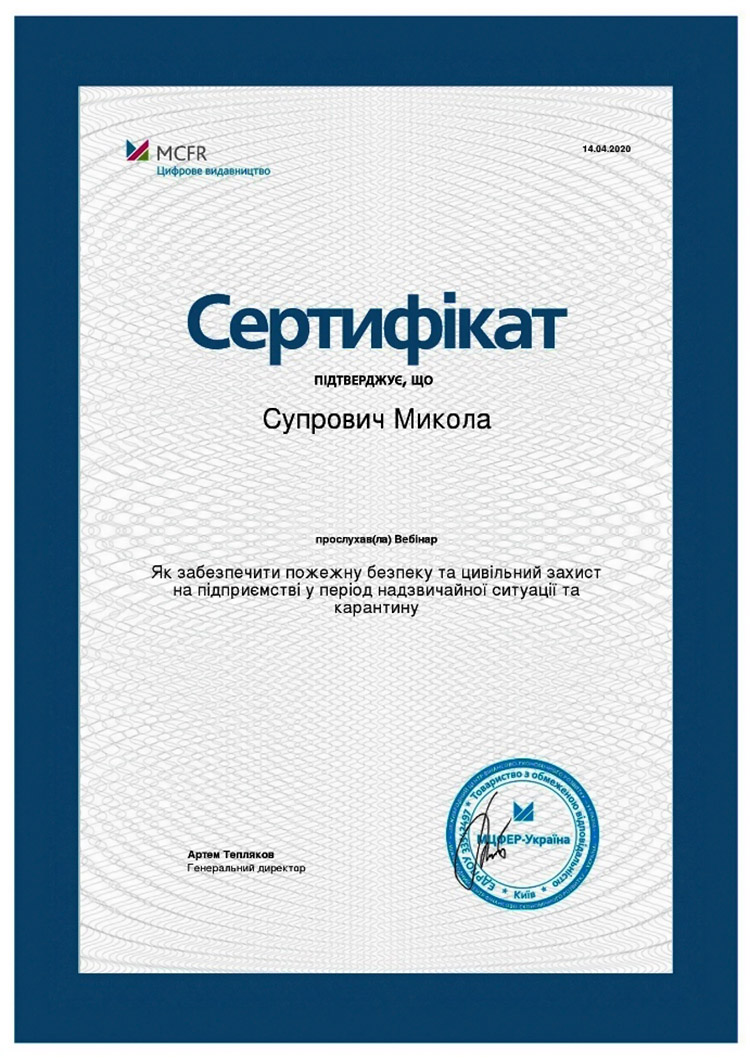 Зокрема, науково-педагогічні працівники стали учасниками вебінару на тему: «Як забезпечити пожежну безпеку та цивільний захист на підприємстві у період надзвичайної ситуації та карантину». Лектор – Рожков Анатолій (експерт з питань пожежної та техногенної безпеки). Вебінар проведено за наступною програмою: