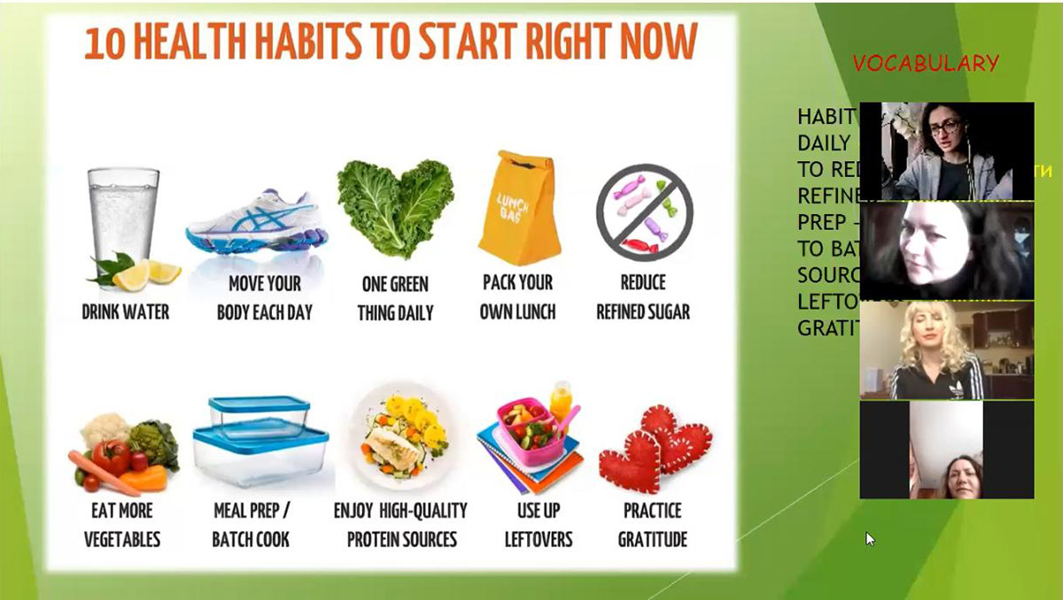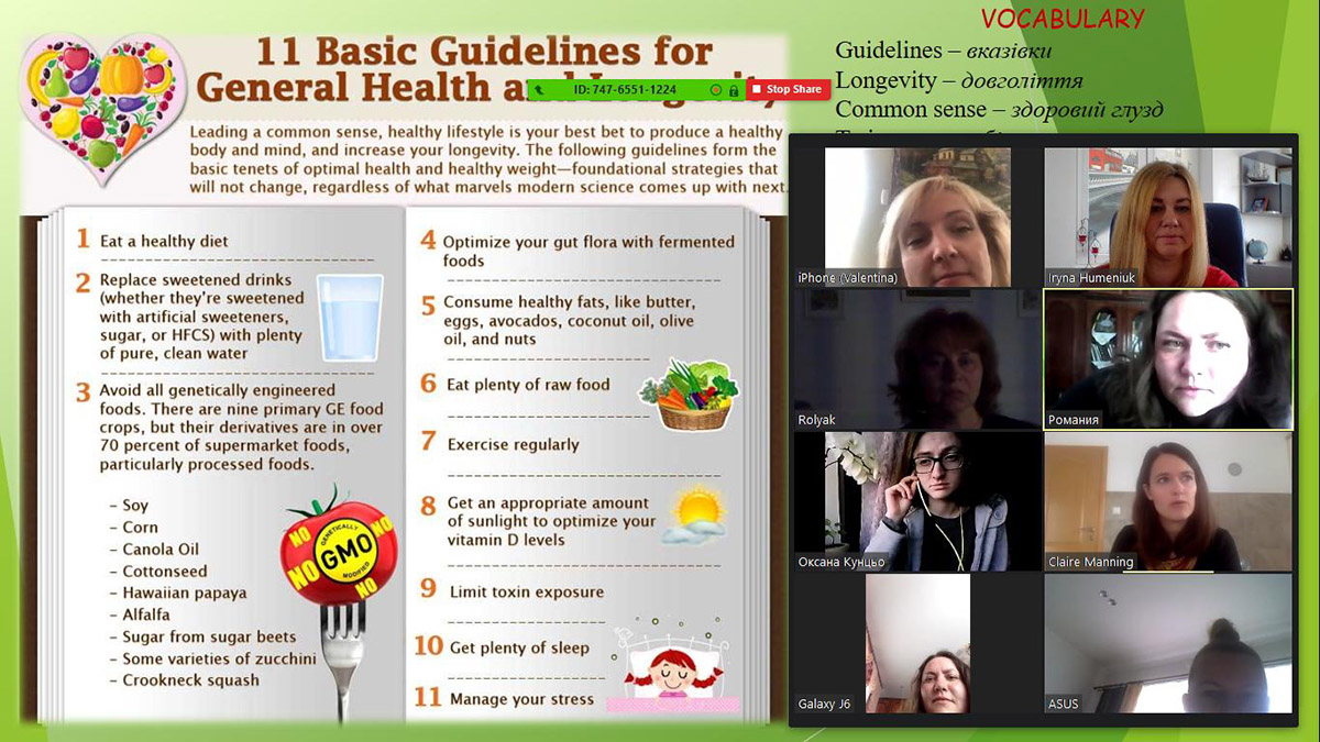 21 квітня 2020 року кафедра організувала та провела онлайн засідання розмовного клубу English Speaking club у форматі Zoom конференції. Тема засідання: «Здоровий спосіб життя» ('Healthy way of life'). Спеціальним гостем зібрання була Клер Елізабет Маннінг (Claire Elizabeth Manning).