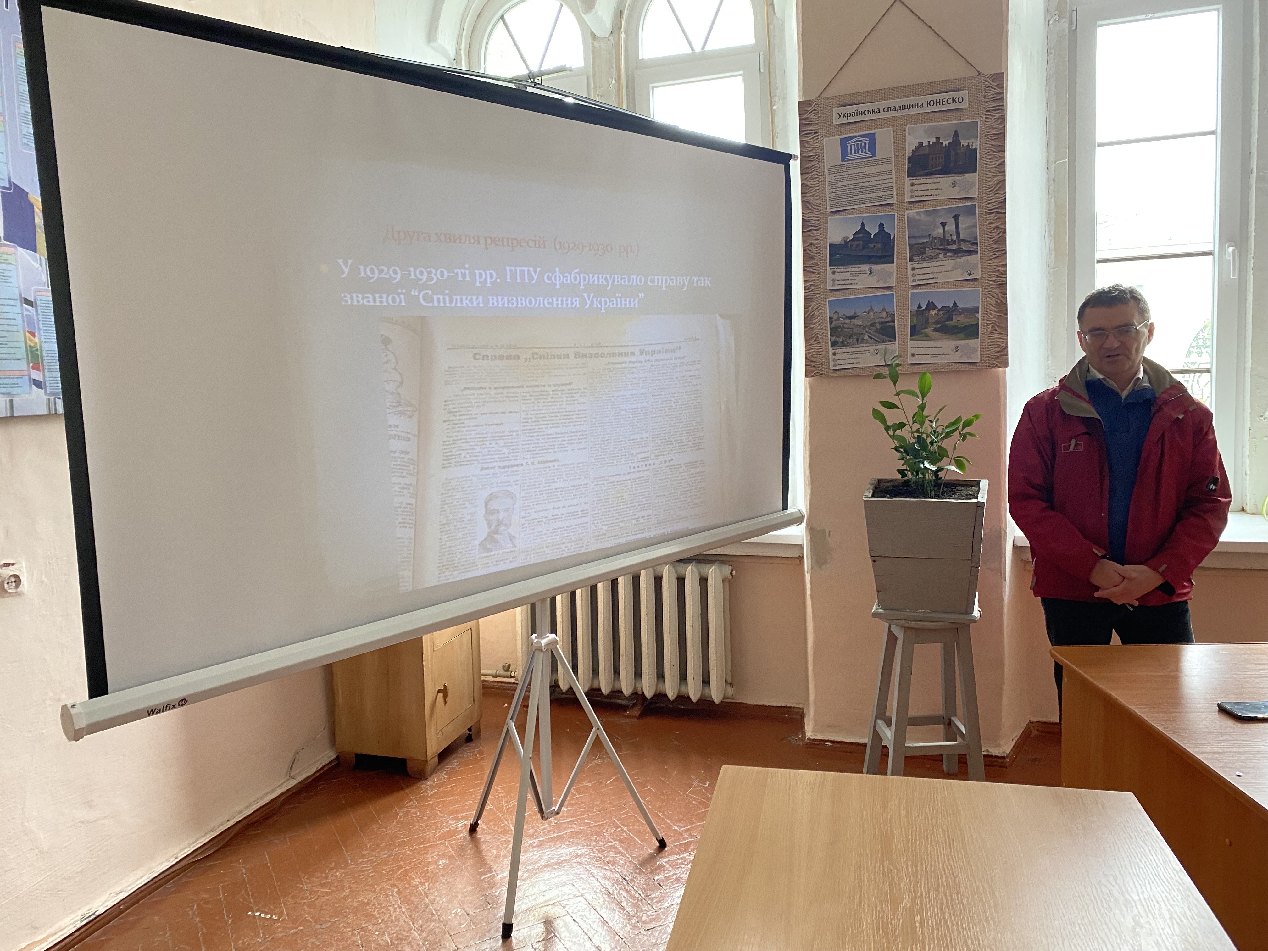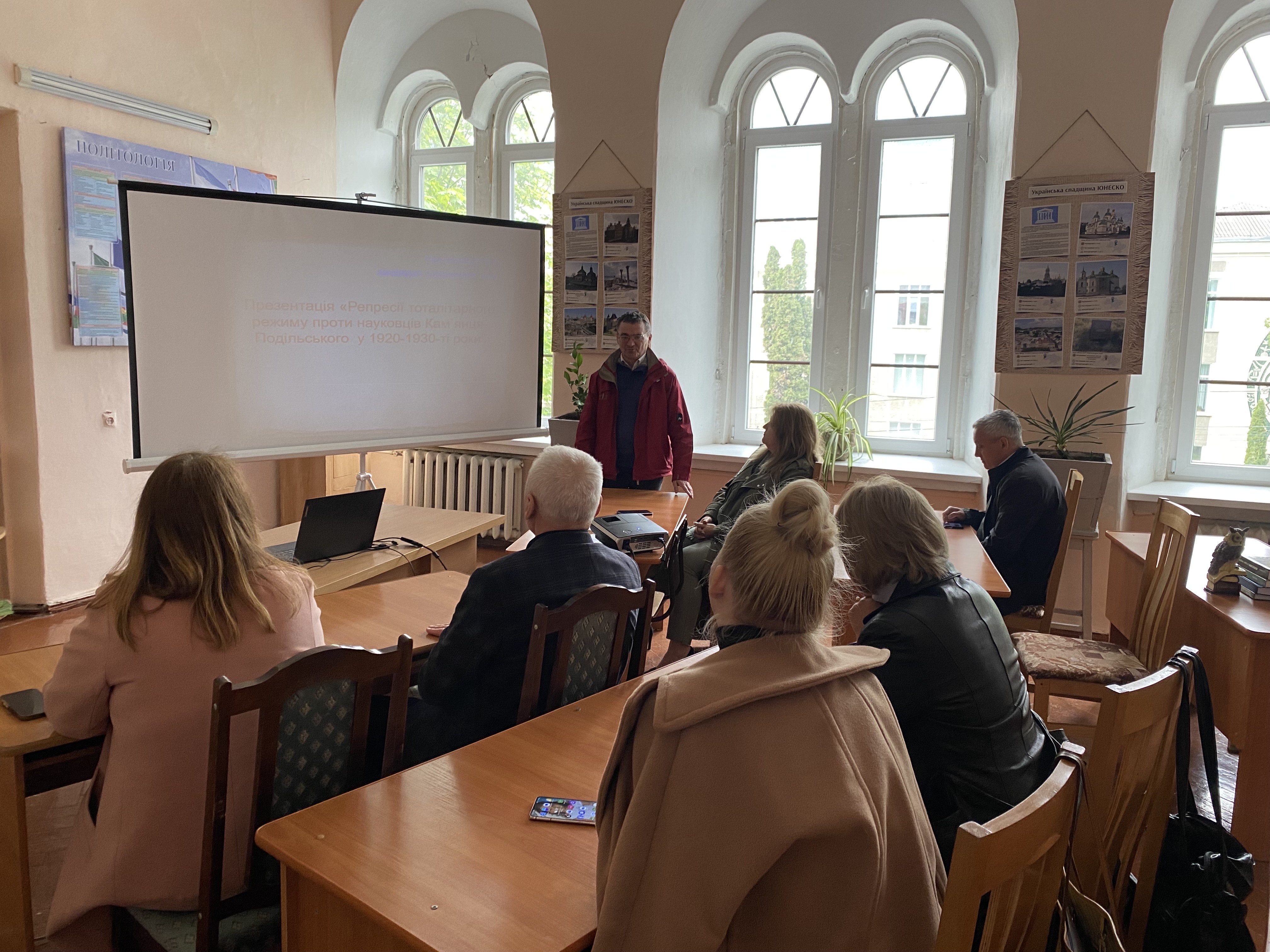 У своїй презентації доцент В. Нестеренко висвітлив роль викладачів закладів вищої освіти Кам’янця-Подільського в період політики «українізації» у розвитку національних соціально-гуманітарних, природничих, вітчизняних наук, підкреслив, що місто у цей час входило в п’ятірку найбільш важливих науково-дослідних центрів УСРР. Проте наприкінці 1920-х розпочались арешти українських вчених у сфабрикованих відділами ГПУ кримінальних справах, внаслідок чого в середині 1930-х рр. наукове життя в місті над Смотричем зовсім занепало. Доповідач наголосив, що подібні насильницькі дії сталінського режиму були виявами етноциду (свідомої політики знищення культури) щодо українського народу та провів паралелі з нинішніми діями рашистів на тимчасово окупованій території України.