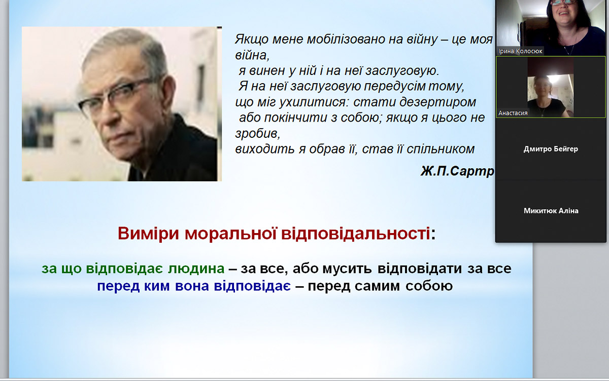 Викладачі кафедри теоретико-правових і соціально-гуманітарних дисциплін Колосюк Ірина Анатоліївна та Боднар Алла Миколаївна провели онлайн лекції і семінарські заняття з навчальної дисципліни філософія студентам денної форми навчання 1-го курсу факультету ветеринарної медицини і технології у тваринництві, економічного та факультету агротехнологій і природокористування. На заняттях розглядалися питання проблеми буття та свідомості у філософії. Відбувся також захист індивідуальних завдань у вигляді презентацій.