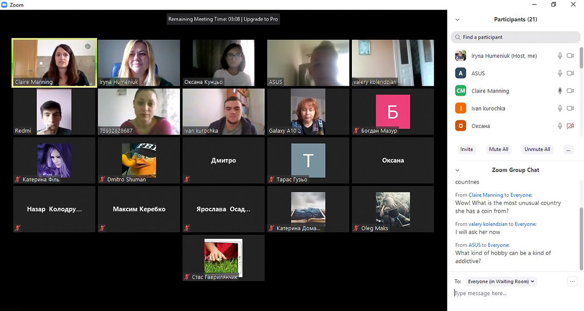 Кафедра іноземних мов організувала та провела 13 травня засідання англомовного дискусійного клубу Подільського державного аграрно-технічного університету у звичному уже онлайн форматі на платформі Zoom. Цього разу до засідання доєдналася 21 особа, в числі НПП кафедри іноземних мов, студентів та слухачі курсів ПДАТУ, особливим гостем була Клер Елізабет Меннінг – волонтер Корпусу Миру США. Тема дискусії: «Незвичні хобі» виявилась надзвичайно цікавою та подекуди провокативною. Присутні залюбки дискутували та задавали свої питання. Засідання видалось жвавим та динамічним.