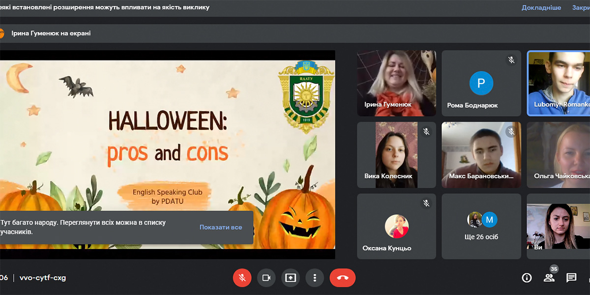 29 жовтня кафедра іноземних мов за власної ініціативи та підтримки адміністрації Подільського державного аграрно-технічного університету провела онлайн захід – відкрите засідання англомовного дискусійного клубу на платформі Google meet. На захід були запрошені студенти ПДАТУ та випускники шкіл та коледжів міста та району, а також усі бажаючі – поціновувачі англійської мови, звичаїв та традицій англомовних країн.